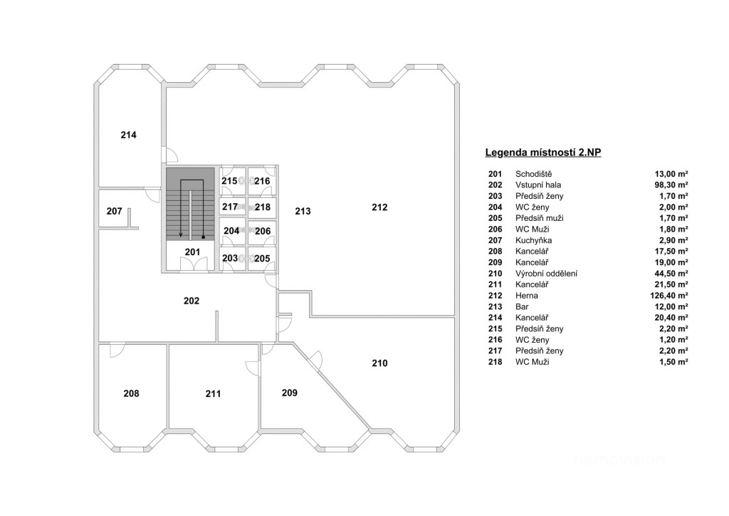 2. nadzemní podlaží - 369,4 m² (ideální pro kanceláře, coworkingové prostory, zasedací místnosti)
