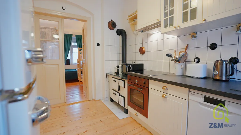 Interiéry apartmánu jsou koncipovány ve stylu 1 republiky. V 1NP se nachází stylový apartmán 2+kk výměře 45m2 v přízemí pro 2-5 hostů. K dispozici je dvoulůžko, samostatná postel a palanda. Plně vybavená kuchyně (lednička, mikrovlnná trouba, sporák s pečící troubou, varná konvice, kávovar, myčka). Smart TV, WiFi, rádio. Koupelna se sprchovým koutem, oddělené WC.