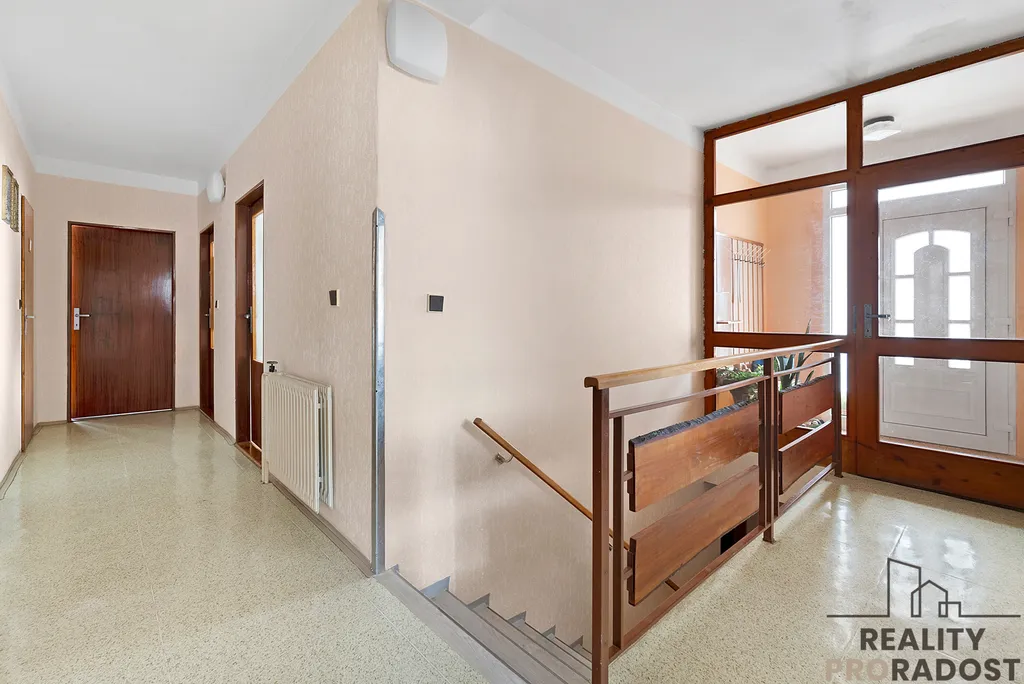ze zádveří projdeme chodbou do světlé a prostorné kuchyně, která je rozdělena nábytkem na kuchyňskou část a jídelnu. Z kuchyně procházíme do obývacího pokoje. Je zde možnost tyto prostory jednoduše propojit. Z chodby se dostaneme do tří samostatných pokojů. Koupelna se sprchovým koutem a vanou je dostatečně velká pro rodinnou domácnost. WC je samostatné. Je zde také šatna a spížka se vstupem z chodby. Z chodby vede schodiště do suterénu domu.