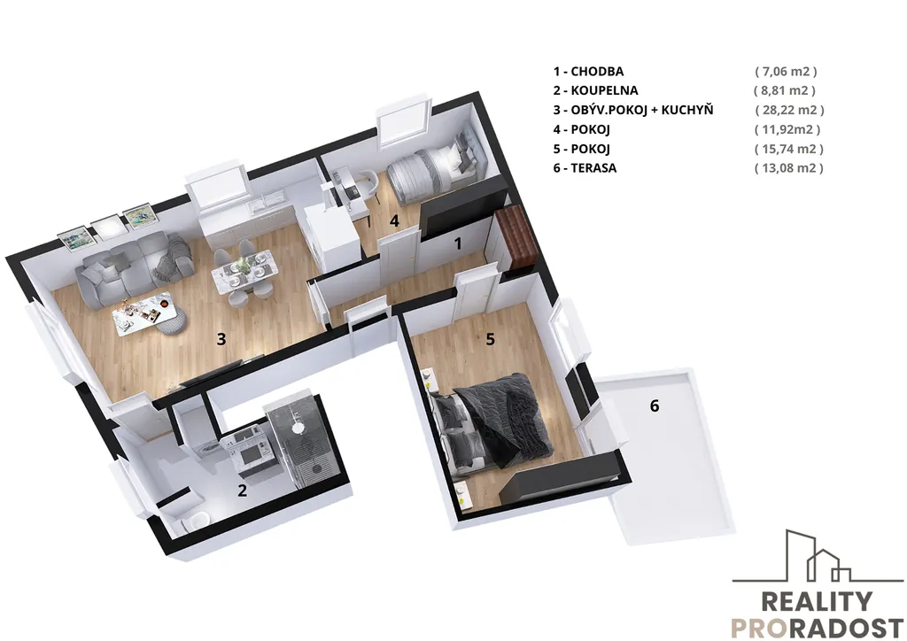 Byt se nachází ve 2. nadzemním podlaží dvoupodlažního objektu a okna má orientována na jih, východ a sever, což zaručuje dostatek přirozeného světla po většinu dne. Velkou výhodou této nemovitosti je prostorná terasa o ploše 13 m², ideální pro relaxaci a venkovní posezení s výhledem do klidného okolí(ve výstavbě s dokončením 2026). Mimo to, k bytu náleží i úložný prostor v 1.NP s plochou 2,42 m² pro uskladnění věcí.