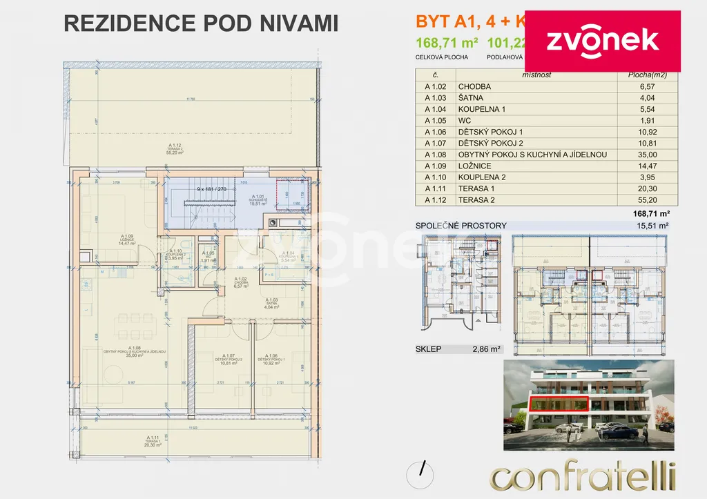 Prostorný obývací pokoj s kuchyní a jídelnou, dvě rozlehlé terasy, tři ložnice, dvě koupelny, šatna a samostatné WC. K bytu dále náleží sklep.