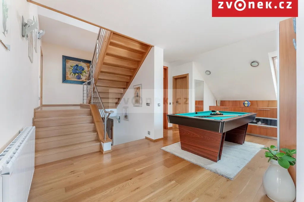 Unikátní dominantou nemovitosti je wellness v suterénu s vlastní terasou: vnitřní vyhřívaný bazén se slanou vodou, sauna, posilovna, prosklená sprcha, WC a prosklený krb, který vyhřívá bazén i okolní prostory. Z bazénové části i z velké venkovní terasy je přímý vstup do udržované zahrady s krásnými výhledy. V domě je osobní výtah vedený od wellness přes obytnou část až do prostoru ložnic.