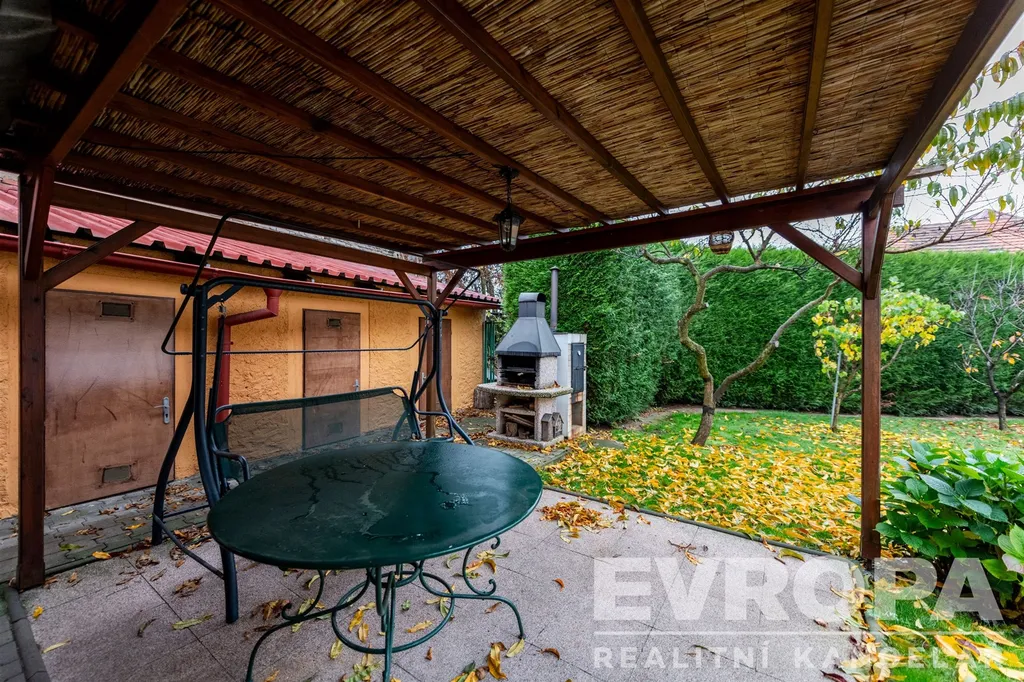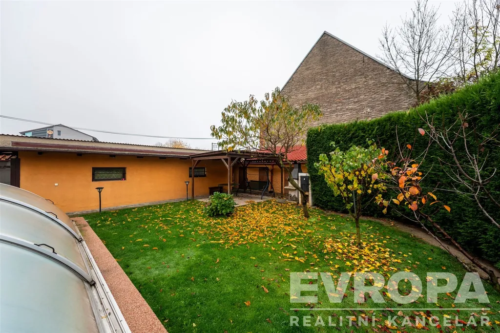 Velká zahrada s prostorem pro relaxaci, bazénem (7×7 m se zastřešením) a místem pro grilování