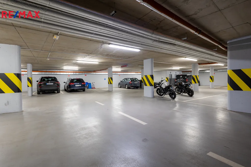 Dům má vysoký standard zabezpečení – vstup do budovy, výtahu i garáží je možný pouze na čip. K bytu náleží také soukromé parkovací místo přímo v domě, což je v této lokalitě velkou výhodou.