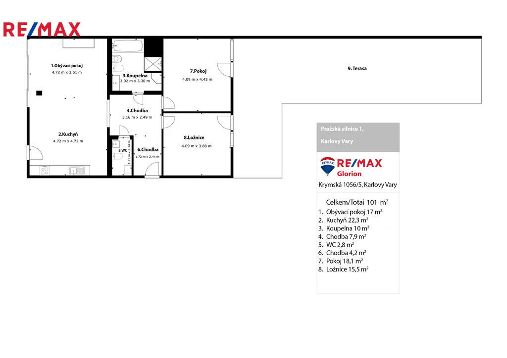 Nabízíme k prodeji prostorný a moderní byt 3+kk o rozloze 99 m2 nacházející se na Pražské ulici s jedinečným výhledem na Imperial. Tento byt je ideální volbou pro ty, kteří hledají komfortní a elegantní bydlení v klidné, ale dobře dostupné lokalitě. V těsné blízkosti se nachází zastávka MHD, škola, školka, obchod z potravinami, Lanovka Imperial, která vás pohodlně dopraví do historického centra města - Kolonádě.