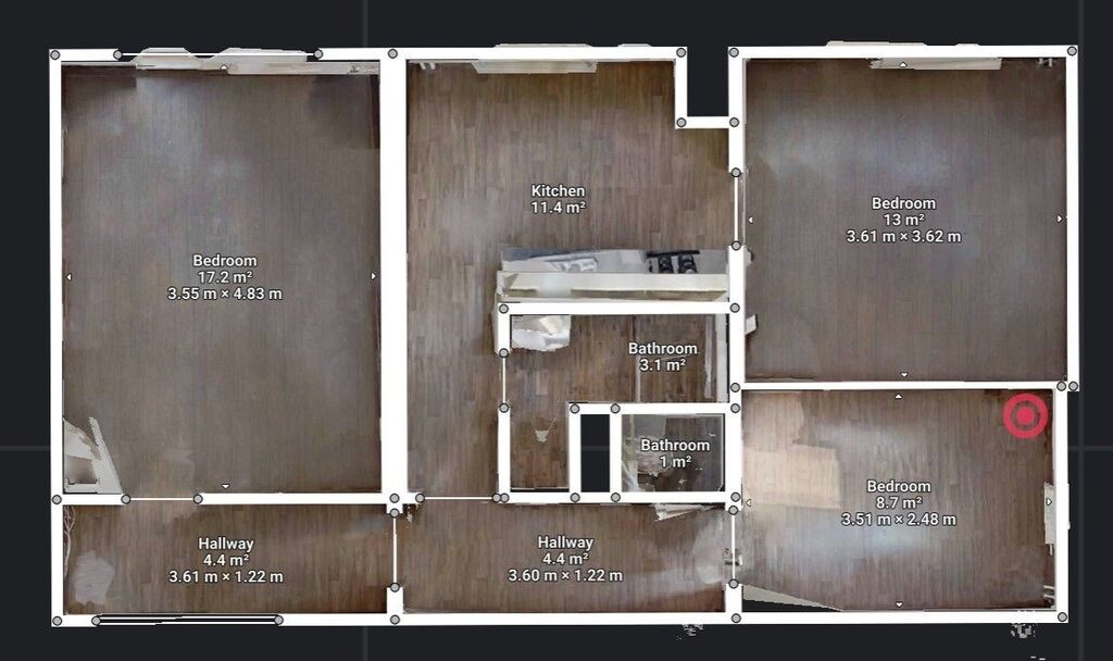 Dispozice: vstup - chodba - kuchyně - pokoj za kuchyní - koupelna se sprch. koutem a prostorem na pračku - obývací pokoj s lodžií - třetí menší pokoj - samostatné WC. K bytu je k dispozici samostatná sklepní kóje v suterénu budovy.