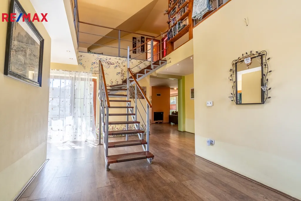 Srdcem domu je prostorný obývací pokoj propojený s kuchyní a jídelnou, kde dominuje krb, který dodává prostoru útulnou atmosféru zejména během chladných večerů. Samostatné pokoje a koupelny umožňují pohodlné vícegenerační bydlení, aniž by se někdo cítil omezený.