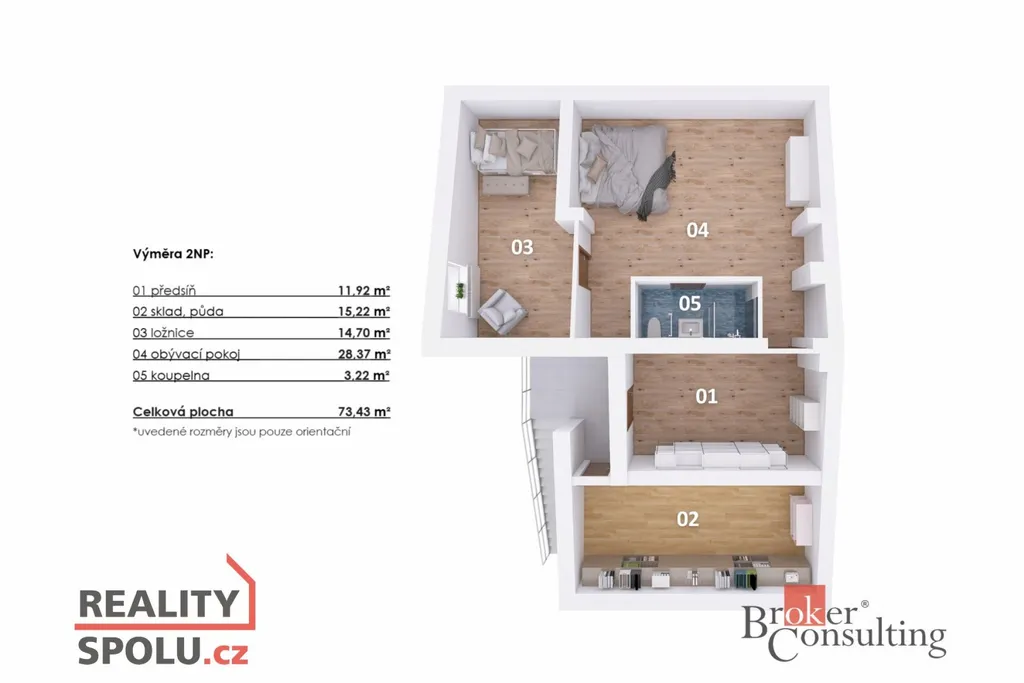 - Byt 2+KK (73 m², 2. NP) – útulný prostor s velkými úložnými prostory.