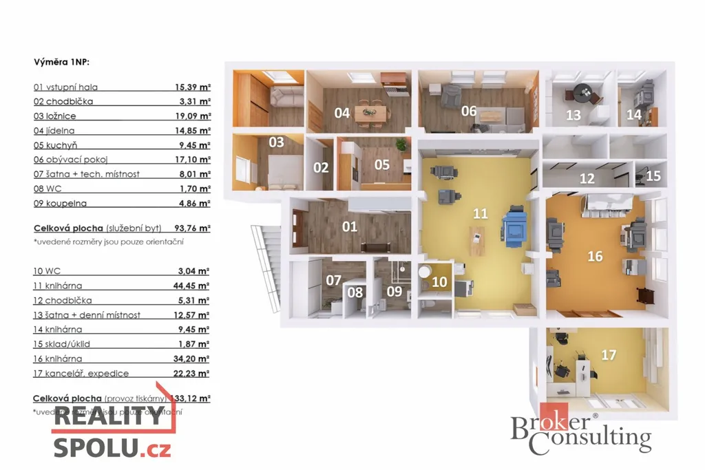 - Výrobní část (133 m²) – možnost přebudovat na bytové jednotky nebo možné využít pro drobnou výrobu, sklady, kanceláře, služby či obchodní prostory. Disponuje kancelářskými prostory a samostatným sociálním zázemím.