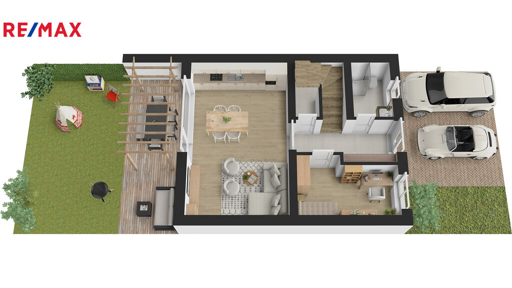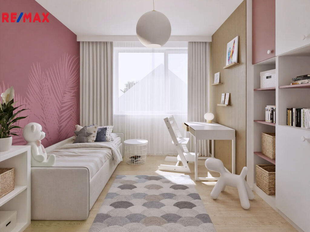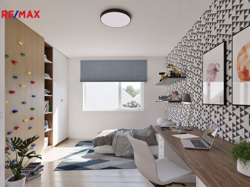 V přízemí domu bude vstupní chodba se schodištěm do patra, kde při vstupu budete mít po pravé straně koupelnu se sprchovým koutem a WC, na levé straně bude výklenek pro vestavěnou šatní skříň. Dále menší pokoj vhodný jako ložnice nebo pracovna. Rovně z chodby projdete do velkého obývacího pokoje, který bude spolu s velkým kuchyňským koutem a jídelnou dominantou celého domu. Z tohoto obývacího pokoje bude vstup na zahradu s terasou, kde můžete umístit pergolu. Zahrada bude oplocená se zadní brankou pro pěší vstup. V chodbě pod schodištěm budete mít úložný prostor a v patře na vás budou čekat tři pokoje a hlavní koupelna s vanou a WC. Jako bonus vám zhotovíme plnohodnotnou velkou místnost v podkroví, kam povede schodiště. Podkrovní pokoj bude mít všechny náležitosti jako jsou střešní okna, podlahovou krytinu, sádrokartonové podhledy i rozvody elektřiny. Tento podkrovní prostor můžete využít jako ložnici, pracovnu nebo hernu. Velkoformátová okna zajistí dostatek přirozeného světla a příprava na venkovní žaluzie umožní regulaci teploty v interiéru. Před domem budou dvě parkovací stání.