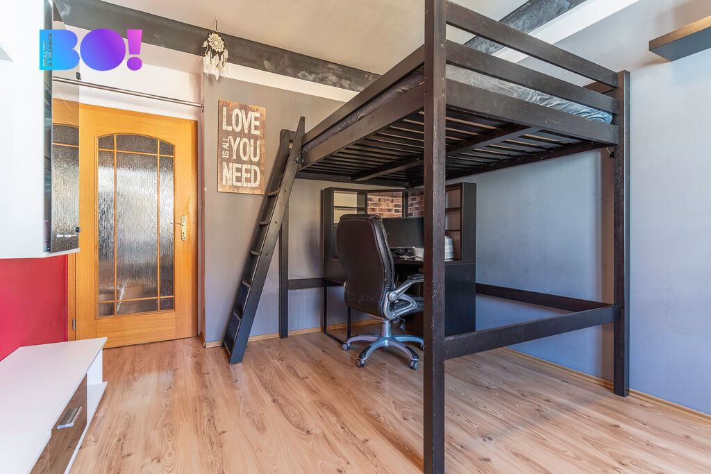 Dispozice bytu zahrnuje prostornou chodbu s vestavěnými skříněmi, moderní obývací pokoj propojený s kuchyní a jídelním koutem, ložnici (případně dětský pokoj), špajz, koupelnu a samostatné WC. Okna jsou vybavena předokenními roletami.