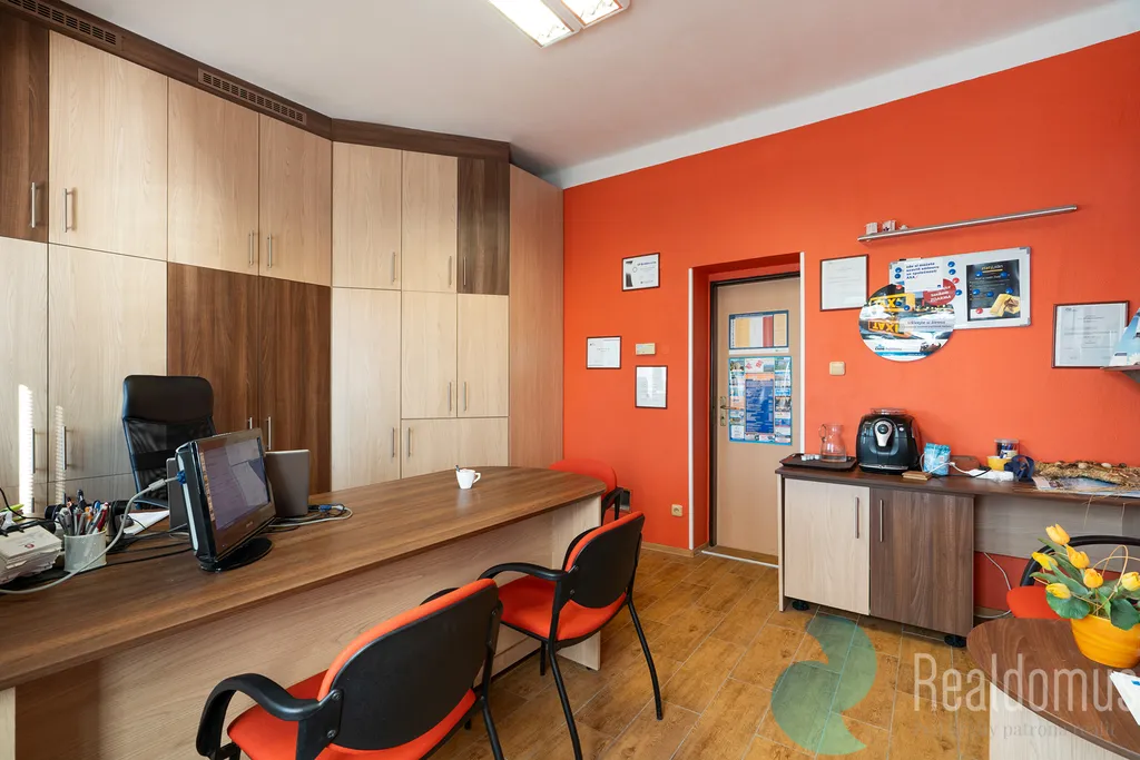 Součástí objektu jsou také kancelářské prostory, což dává možnost využití nemovitosti jak k bydlení, tak i k podnikání. Vytápění je zajištěno plynovým kotlem napojeným na rozvody ústředního topení a dům je napojen na veřejný vodovod a kanalizaci, dešťové svody směřují do kanalizace.