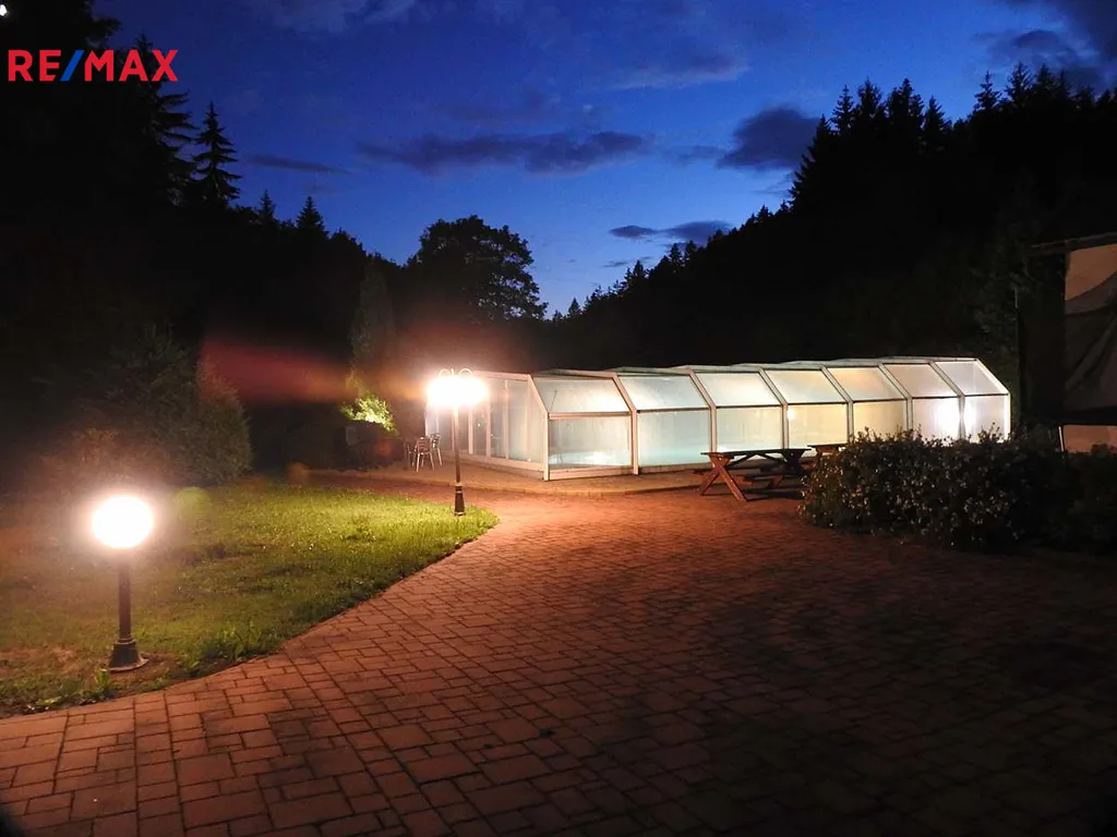 K nemovitosti dále patří krytý osvětlený venkovní bazén se slanou vodou 5x10m s protiproudem (zastřešení 8x14 m). Profesionální whirlpoolka pro 5 osob s LED osvětlením – světelná terapie, ozvučená, s vodopádem vás uhrane, najdete v ní absolutní relax.