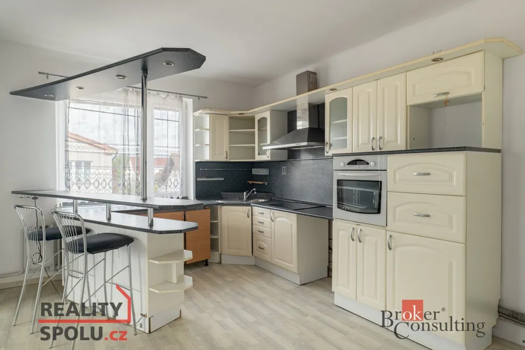 - v prvním patře je velká kuchyň spojená s obývacím pokojem a druhou koupelnou