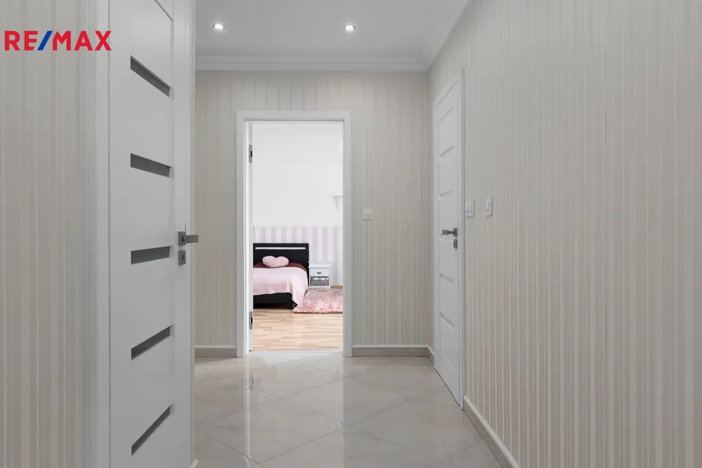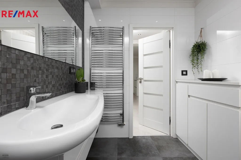V bytě se nachází hostinská toaleta a koupelna. Komfort v chladných měsících zajišťuje podlahové vytápění v chodbě a koupelně, které dodává příjemné teplo a zvyšuje pohodlí. Celý dům je napojen na centrální dálkové vytápění, což zajišťuje efektivní a rovnoměrné vytápění všech místností.