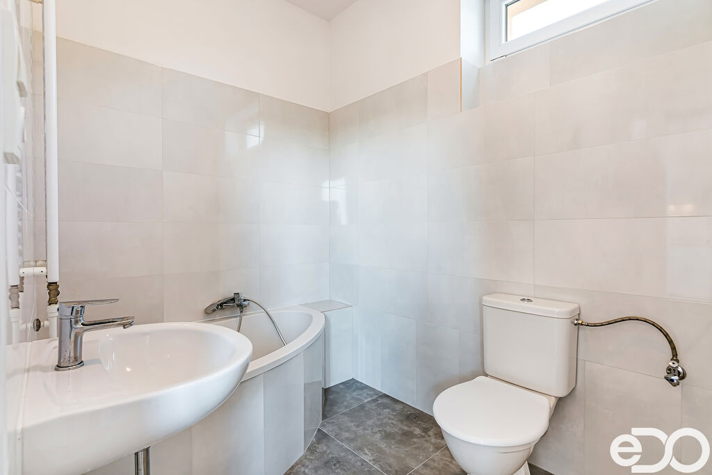 Koupelna je rovněž po rekonstrukci, nová dlažba, obklady a sanita – rohová vana, umývadlo, WC, dále příprava vody a odpadu pro pračku.