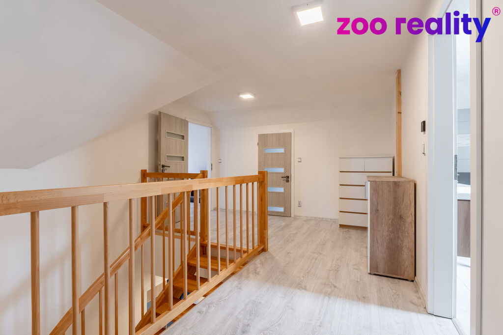 V přízemí domu nalezneme 3 samostatné ložnice, větší a menší koupelnu, obývací pokoj spojený s kuchyní, technickou místnost, garáž a výstup na 30ti metrovou terasu. V prvním patře jsou situovány dva velké pokoje. Jeden o velikosti 22m2 a druhý 38m2 včetně šatny. Samozřejmostí je další koupelna a menší komora. V suterénu domu jsou 3 další místnosti, každá o ploše 25 až 35m2. Nyní využívané jako skald dřeva, dílna a letní kuchyně včetně samostatné toalety. Celý suterén je z betonového monolitu.