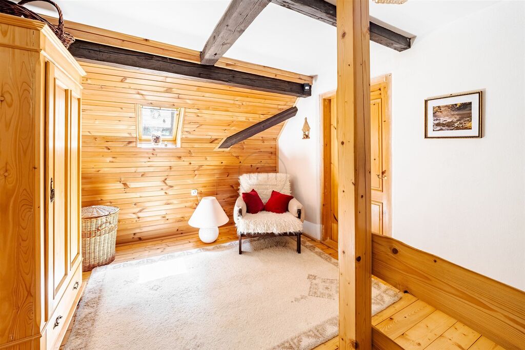 Exkluzivitu podtrhují dřevěné prvky, kachlová kamna, vytápění s ovládáním přes telefon, trámové stropy, nadkrokevní izolace aj. Díky přirozenému světlu a okolní přírodě je v kombinaci s vůní dřeva celý prostor velice příjemný a navozuje klidný a výjimečný zážitek.