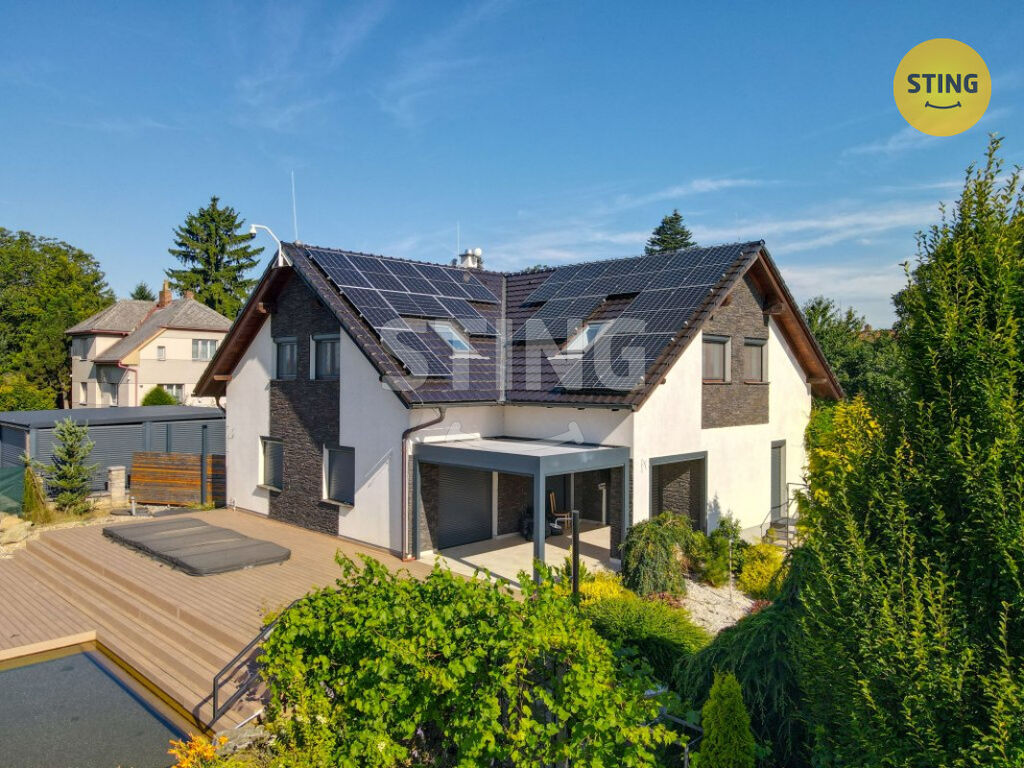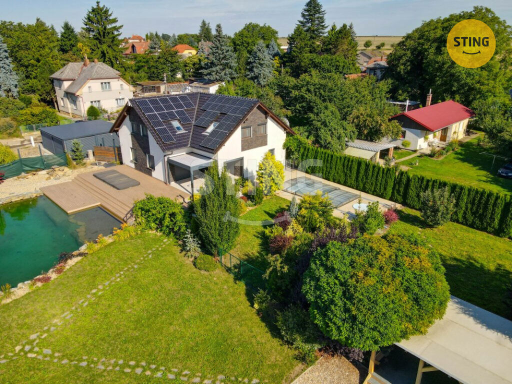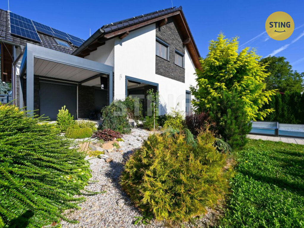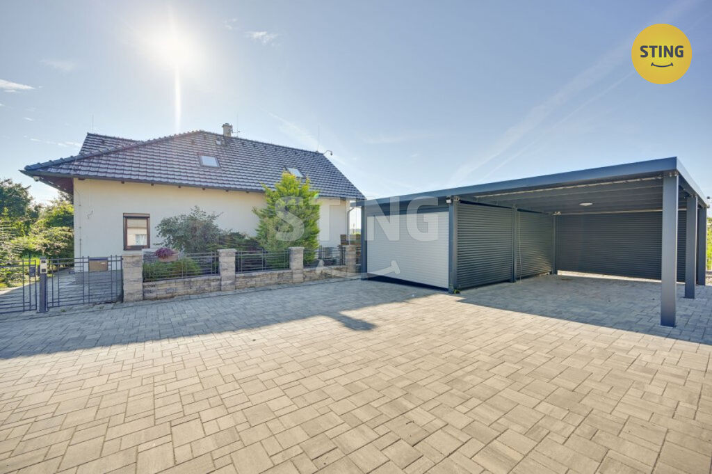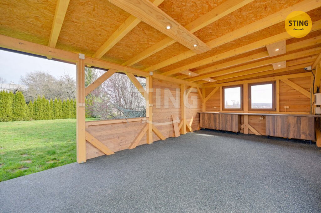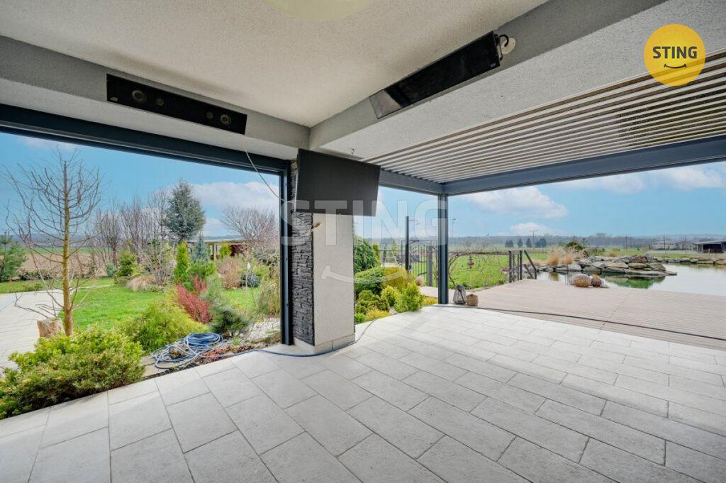Pozemek a parkování: na upraveném pozemku o rozloze 954 m2 se nachází krytý bazén se slanou vodou a protiproudem, dále letní kuchyně s napojením na elektřinu a vodu. Terasa je osazena infra zářiči a venkovními žaluziemi, které umožňují pohodlné využití prostoru i za nepříznivého počasí. K dispozici je dále garáž, zastřešené parkovací stání a venkovní plocha pro další vozidla.