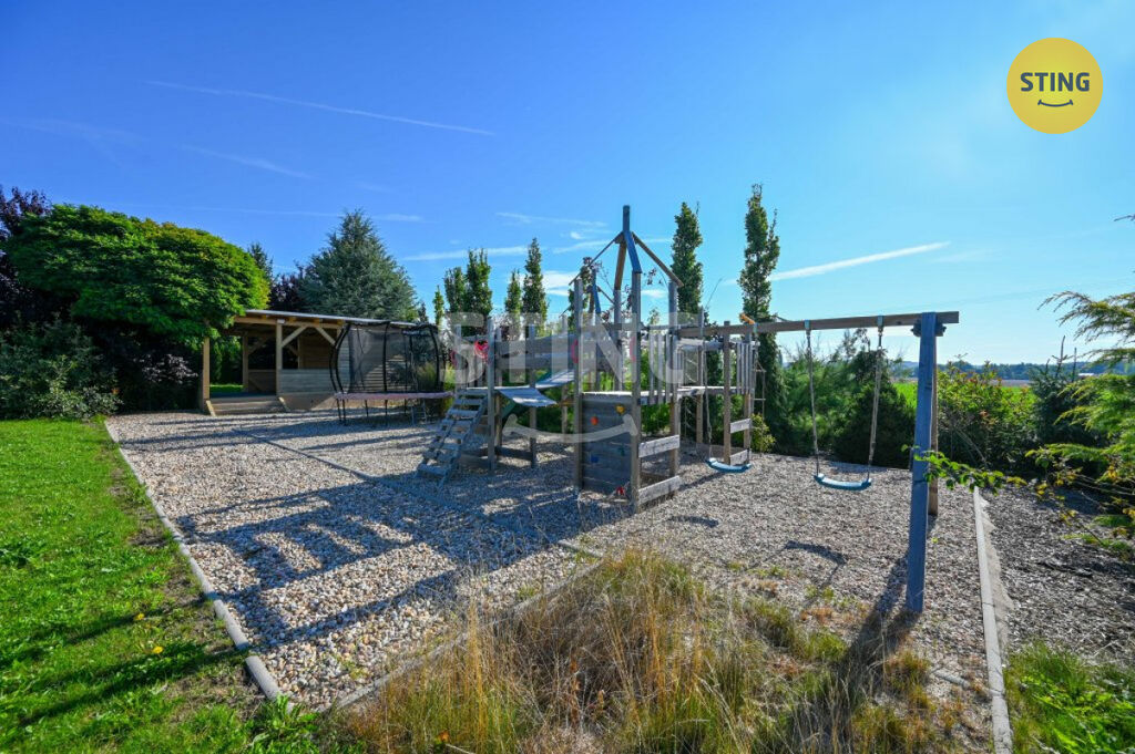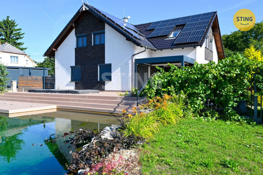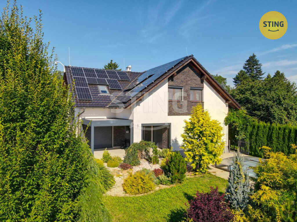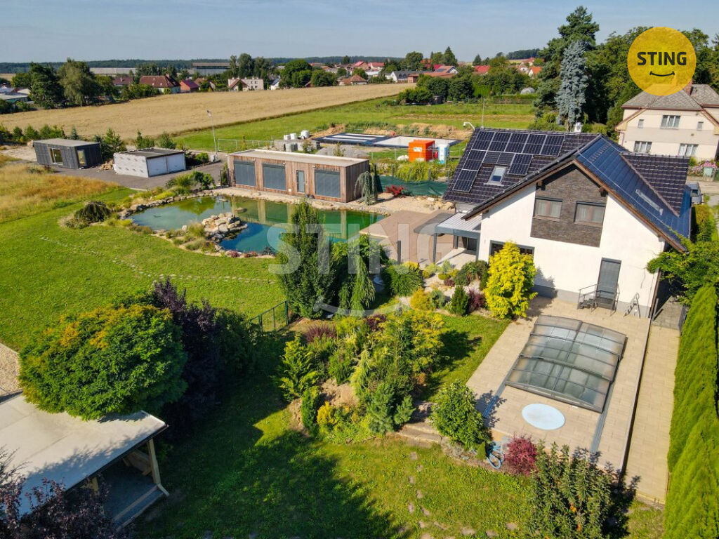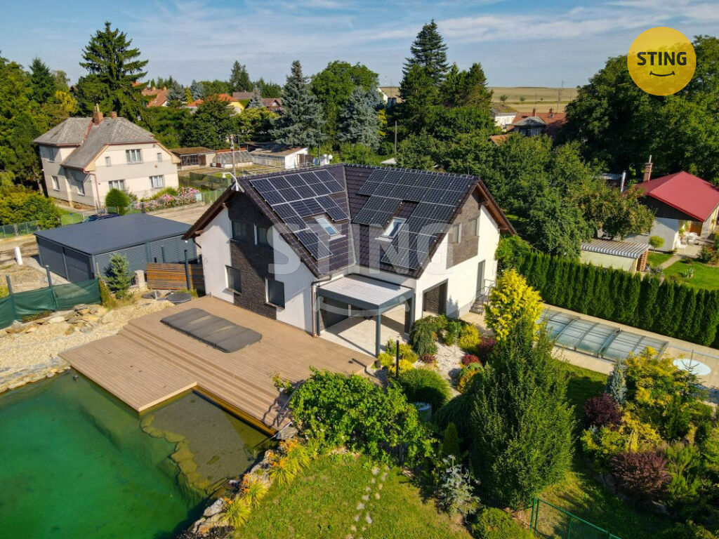 Pozemek a parkování: na upraveném pozemku o rozloze 954 m2 se nachází krytý bazén se slanou vodou a protiproudem, dále letní kuchyně s napojením na elektřinu a vodu. Terasa je osazena infra zářiči a venkovními žaluziemi, které umožňují pohodlné využití prostoru i za nepříznivého počasí. K dispozici je dále garáž, zastřešené parkovací stání a venkovní plocha pro další vozidla.