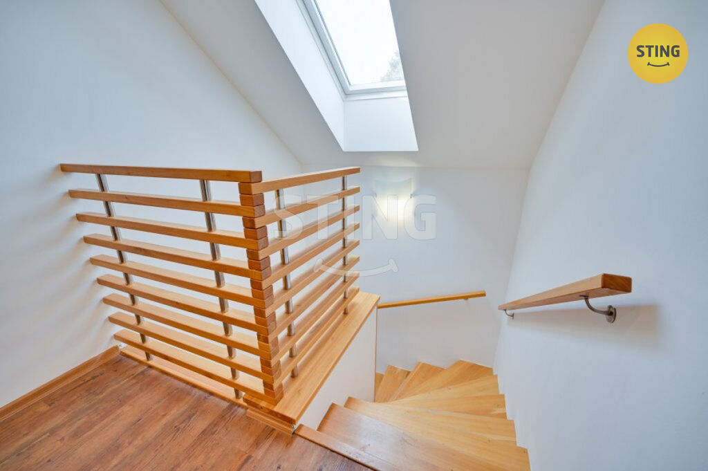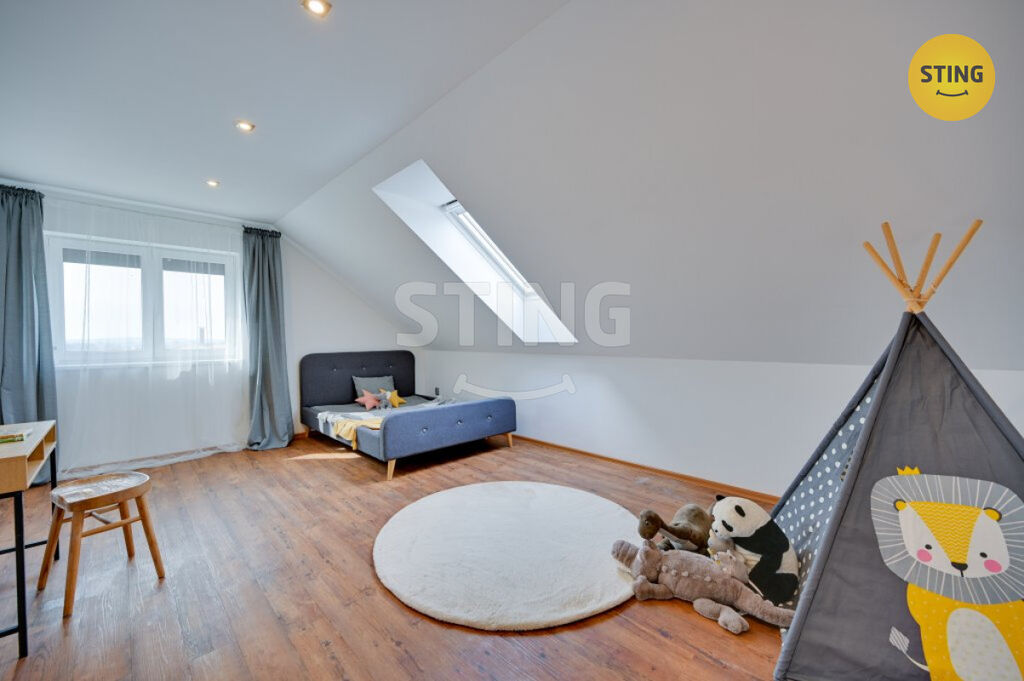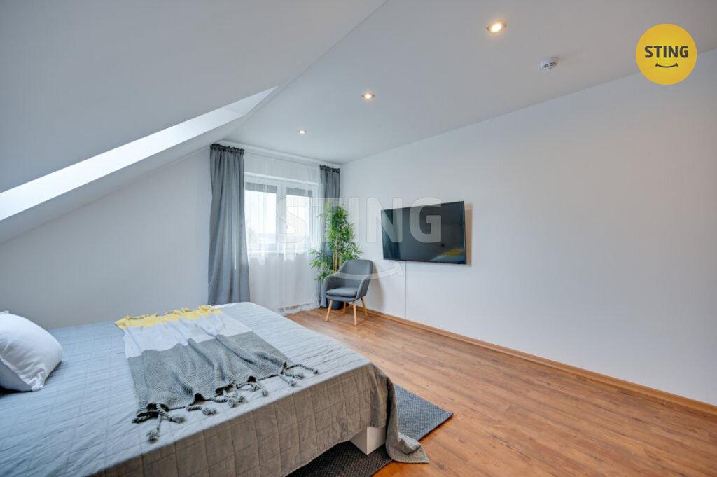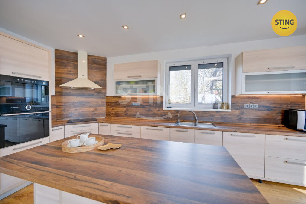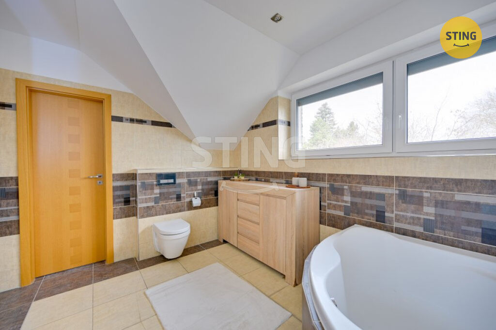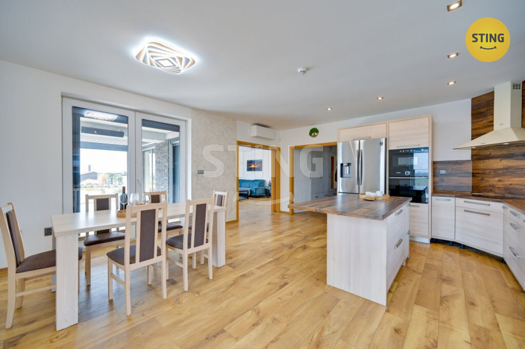 Pozemek a parkování: na upraveném pozemku o rozloze 954 m2 se nachází krytý bazén se slanou vodou a protiproudem, dále letní kuchyně s napojením na elektřinu a vodu. Terasa je osazena infra zářiči a venkovními žaluziemi, které umožňují pohodlné využití prostoru i za nepříznivého počasí. K dispozici je dále garáž, zastřešené parkovací stání a venkovní plocha pro další vozidla.