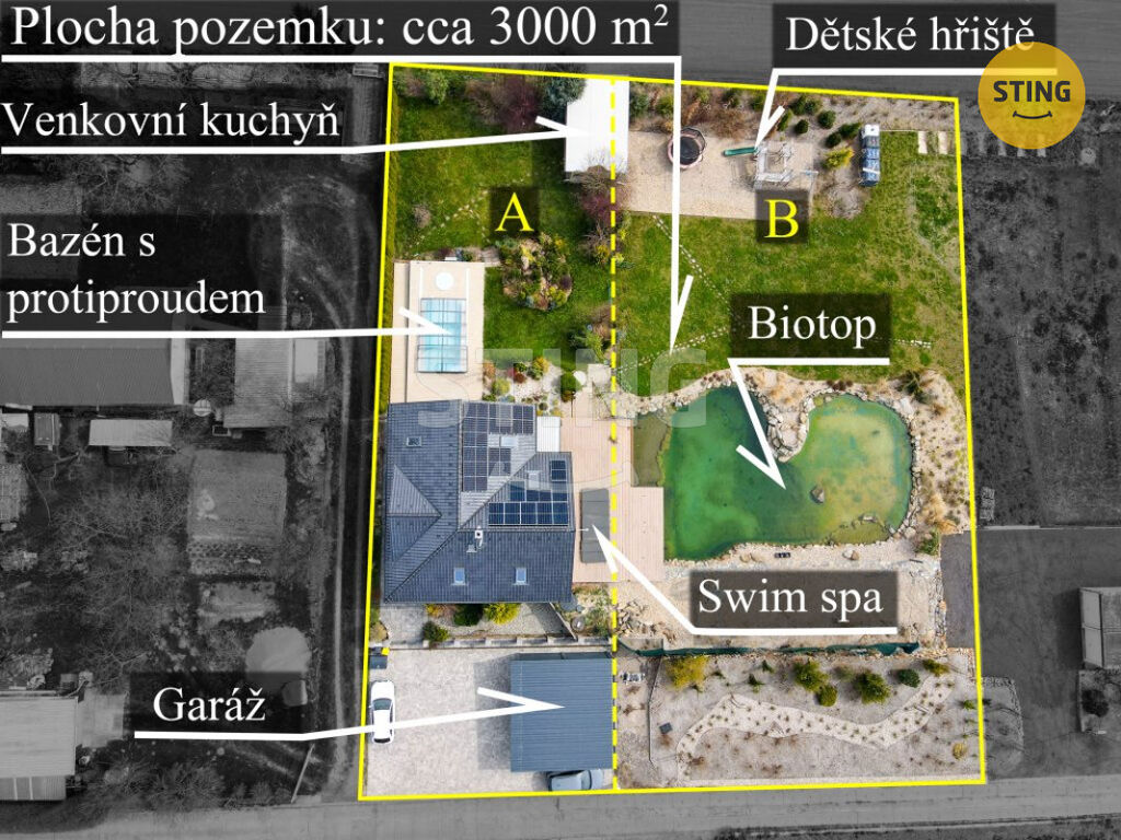Součástí prodeje je plocha A (954 m²). V případě zájmu je možné dokoupit i navazující část pozemku – plochu B (cca 2000 m²), která zahrnuje biotop a dětské hřiště. Cena za dokoupení plochy B činí 1,5 mil. Kč. Celková plocha pozemku by tak mohla dosáhnout cca 3000 m².