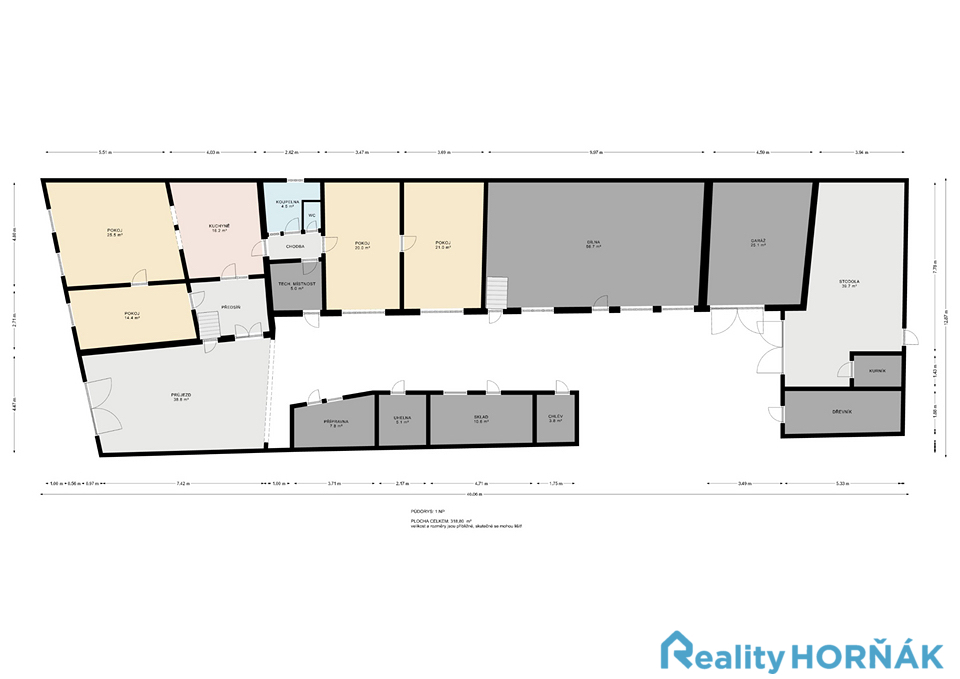 Dispozičně dům nabízí jednotlivé místnosti takto: předsíň (8,9 m2), kuchyni (16,2 m2) s jídelnou, obývací pokoj (25,5 m2), ložnici (14,4 m2), dva dětské pokoje (21,0 a 20,5 m2), chodbu (4,9 m2), koupelnu ( 4,5 m2), WC (1,4 m2) a technickou místnost. Ze dvora jsou přístupné další místnosti rodinného domu - dílna (56,7 m2) a garáž ( 25,1 m2). Po pravé straně dvora jsou bývalé chlívky, nyní užívané jako přípravna (7,8 m2), uhelna (5,1 m2), sklad (10,6 m2) a chlívek (3,8 m2). Ze zadní části dvora vstupujeme do stodoly (39,7 m2), s dřevníkem (10,0 m2) a kurníkem 2,9 m2). Po průchodu stodolou vstupujeme na zahrádku se skleníkem a přímým přístupem k Černovickému potoku.