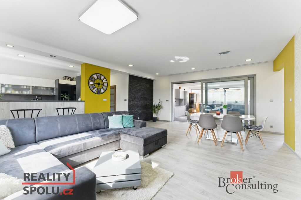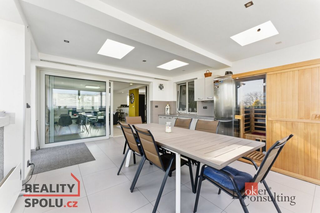 Jednopodlažní novostavba o užitné ploše 224 m² je promyšleně rozdělena do tří částí. V soukromé zóně najdete tři dětské pokoje, ložnici se šatnou a moderní koupelnu. Společenskou část tvoří velký otevřený prostor s kuchyní, jídelnou a obývacím pokojem, který navazuje na zimní zahradu s letní kuchyní, posezením a výhledem do zeleně. Nechybí ani sauna, která dodává domu jedinečný nádech komfortu. Třetí část je praktické zázemí – pracovna, technická místnost a druhá koupelna.