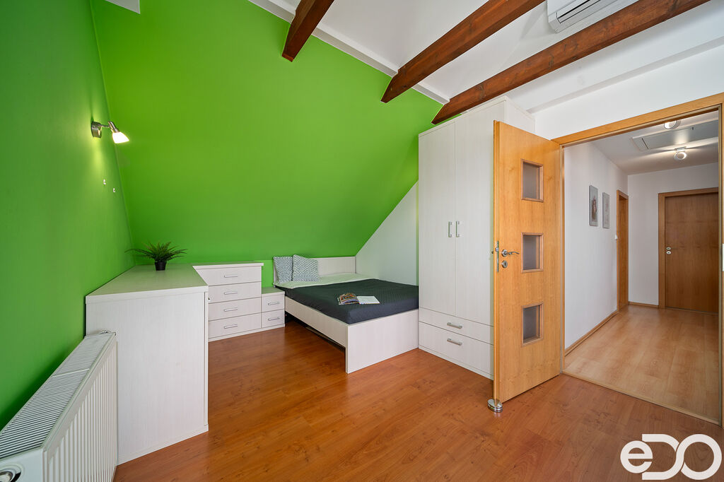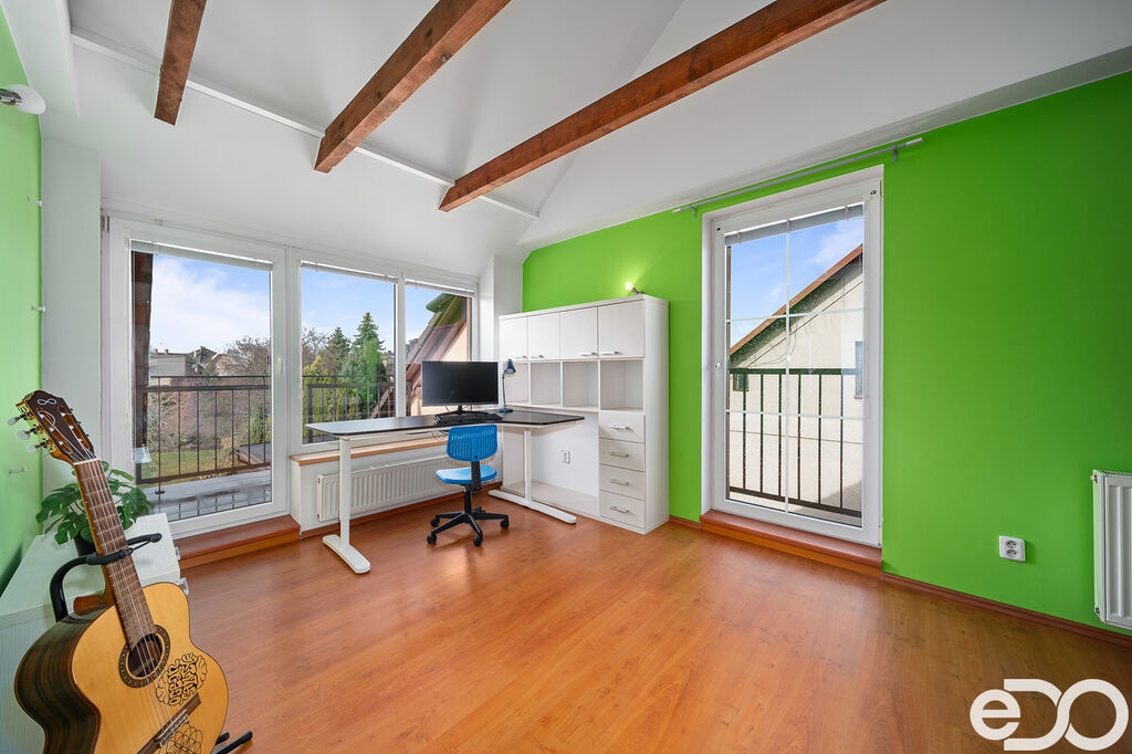Dispozice v podkroví: pokoj s výstupem na balkon, ložnice, dětský pokoj, koupelna se sprchovým koutem a WC.