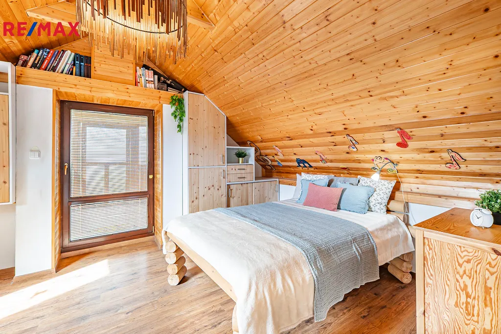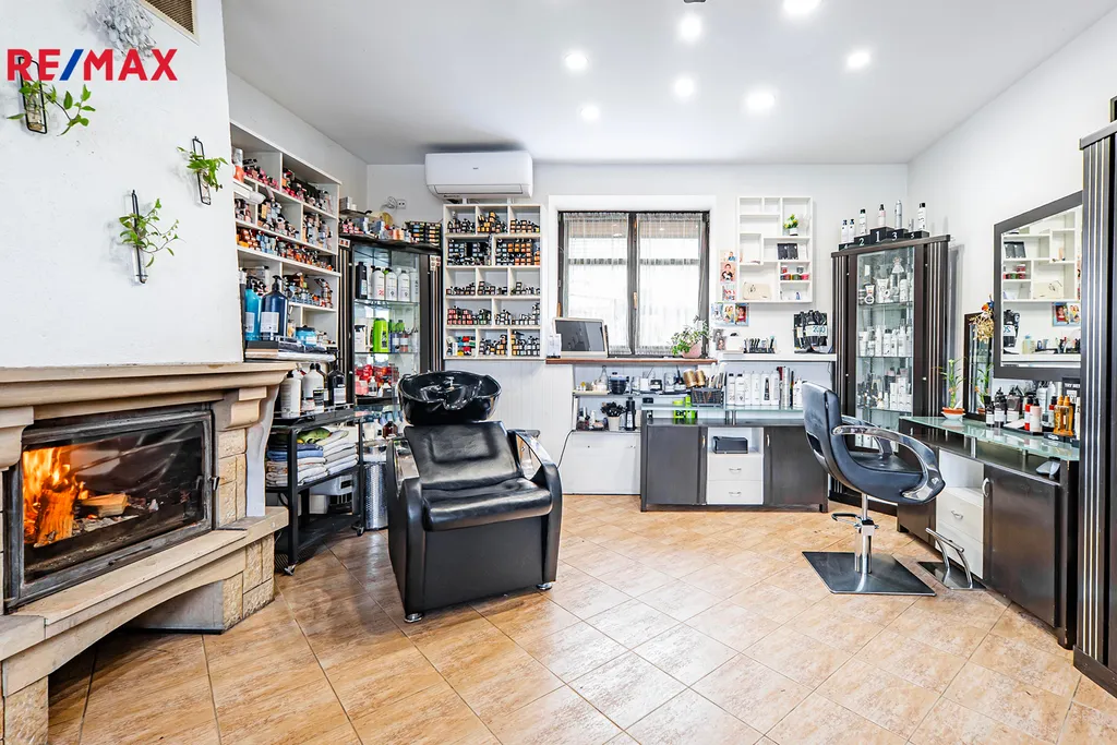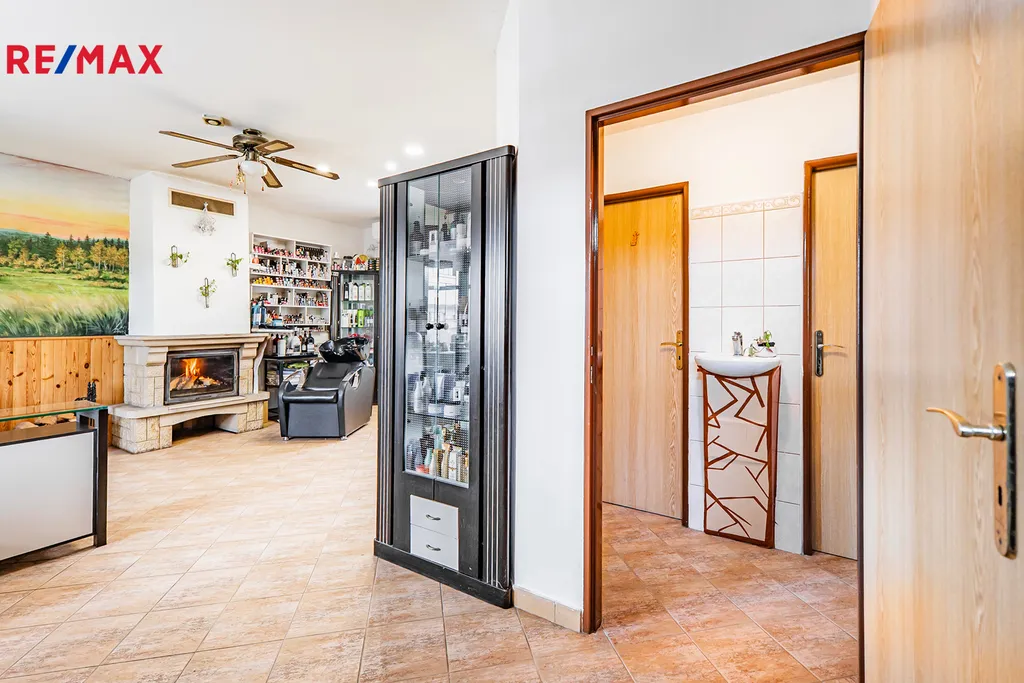 V domě se nachází dvě kuchyně, obývací pokoj, čtyři samostatné pokoje v patře včetně šatny a malé spíže u horní kuchyně. V přízemí je jeden velký pokoj (aktuálně kadeřnictví) a přes chodbu další samostatný pokoj (bývalé kadeřnictví). Součástí domu je také zastřešená veranda (balkon), dvě koupelny (jedna v přízemí s oddělenou šatnou), pět toalet, garáž, malý sklep ve starší části domu s tlakovou nádobou na studnu, skladový prostor vedle garáže na zahradní nábytek a podzemní kamenný sklep s klenutými stropy ideální pro uskladnění zeleniny. Dispozice tedy umožňuje pohodlné vícegenerační soužití i oddělené provozy, případně kombinaci bydlení a podnikání.