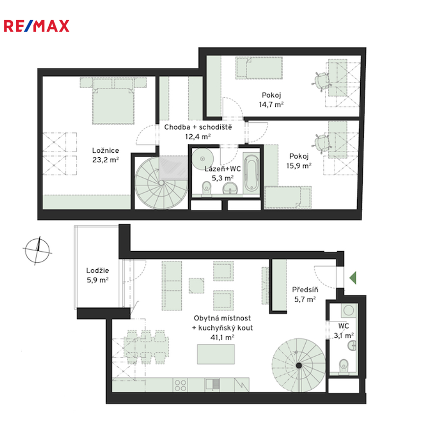 Po točitém schodišti se dostanete do horního patra bytu, kde je chodba s postupnými vstupy do koupelny s vanou a WC, hlavní ložnice a 2 samostatných pokojů. Naproti schodišti je také praktická šatna.