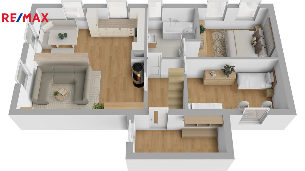 1. NP: zádveří, chodba, prostorná obytná kuchyně s jídelním koutem propojená s obývacím pokojem, ložnice, dětský pokoj, koupelna s WC