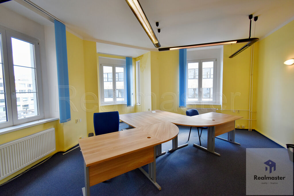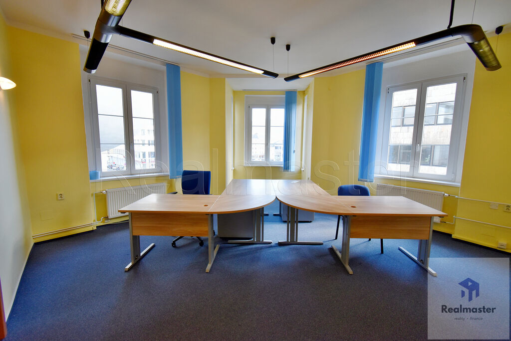 Tři patra kanceláří s vlastním zázemím, kuchyňkou a toaletou. Výtahem vyjedete až do třetího patra. Prostory jsou vybaveny kancelářským nábytkem, na podlahách jsou zátěžové koberce.