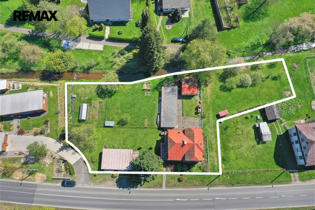 Na části pozemku se nachází rodinný dům se dvěma samostatnými bytovými jednotkami o dispozici 2+1, kdy obě bytové jednotky mají podlahovou plochu přes 70 m². K domu náleží terasa o výměře 11 m², dvojgaráž, samostatná budova sauny, dílna a další skladovací prostory. Celý areál je situován v klidné části obce a jeho atmosféru dotváří potůček, který protéká na hranici pozemku.