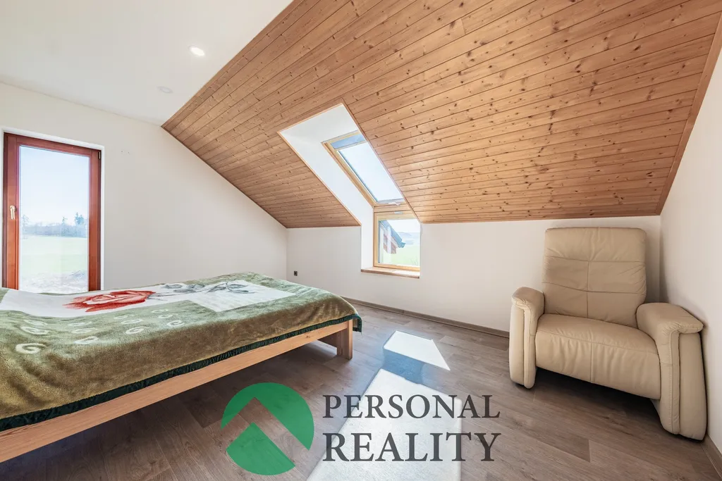 Dubové schody Vás zavedou do patra domu, kde najdete 3 ložnice (jedna s šatnou a jedna s vlastní koupelnou) a hlavní koupelnu s rohovou vanou a prostorným sprchovým koutem.
