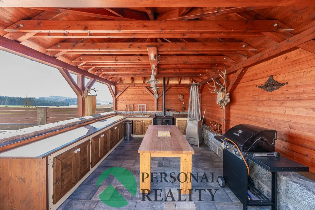 Příslušenstvím domu je krytý bazén o velikosti 4x8 m se slanou vodou, protiproudem a vytápěním, velká krytá letní kuchyně zajistí pohodové zahradní párty a grilování, garáž může sloužit jako dílna a kryté parkovací stání ochrání vozový park před nepřízní počasí.