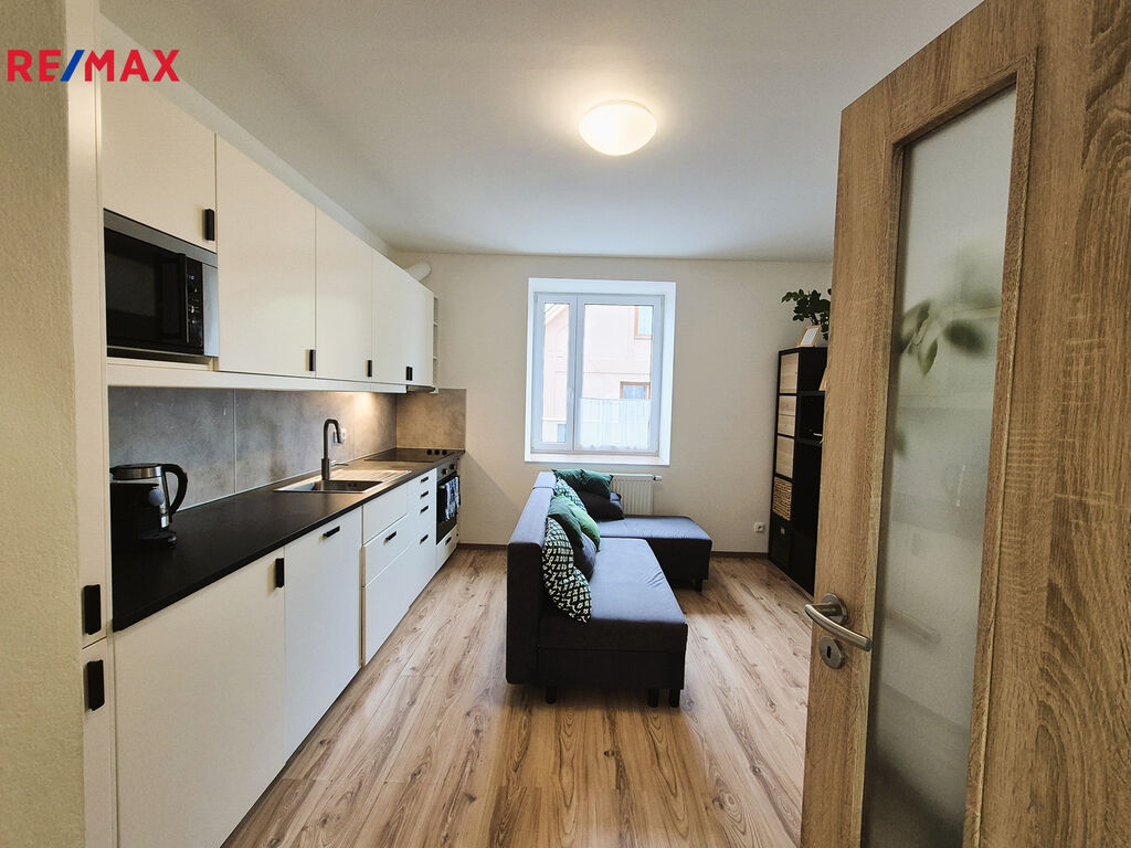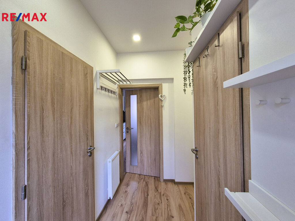 Za vstupem do bytu je vlevo vstup do koupelny se sprchovým koutem a vpravo do samostatného WC. Dále vpravo pokračuje prostor předsíně, odkud je vstup do úložného prostoru, šatny a do ložnice o ploše cca 9 m2. Přímo proti vchodu do bytu je vstup do obývacího pokoje o ploše cca 16m2 s kuchyňským koutem (kompletně vybavená kuchyňská linka s dřezem, vestavěnou myčkou, vestavěnou lednicí a elektrickým sporákem s varnou sklokeramickou deskou, horkovzdušnou troubou a digestoří).