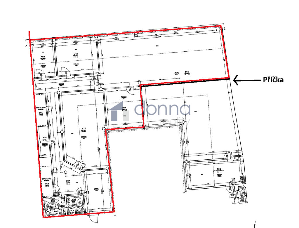 Dispozice prostor: vstupní hala, 4 x kancelář (12,5 m2, 21,5 m2, 21,4 m2 + 48 m2), rozlehlý open space, soukromá kuchyňka, toalety a sklad.