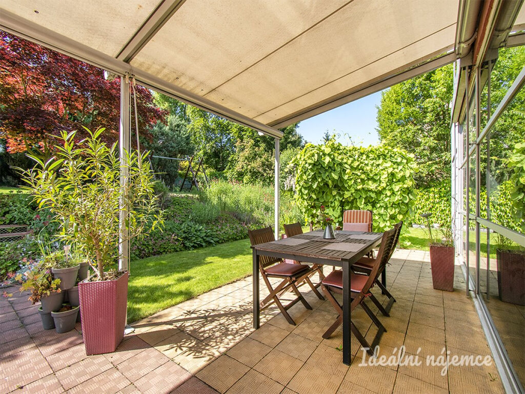 Zahrada nabízí dlážděnou terasu s elektricky ovládanou pergolou s příjemným posezením, automatický zavlažovací systém.