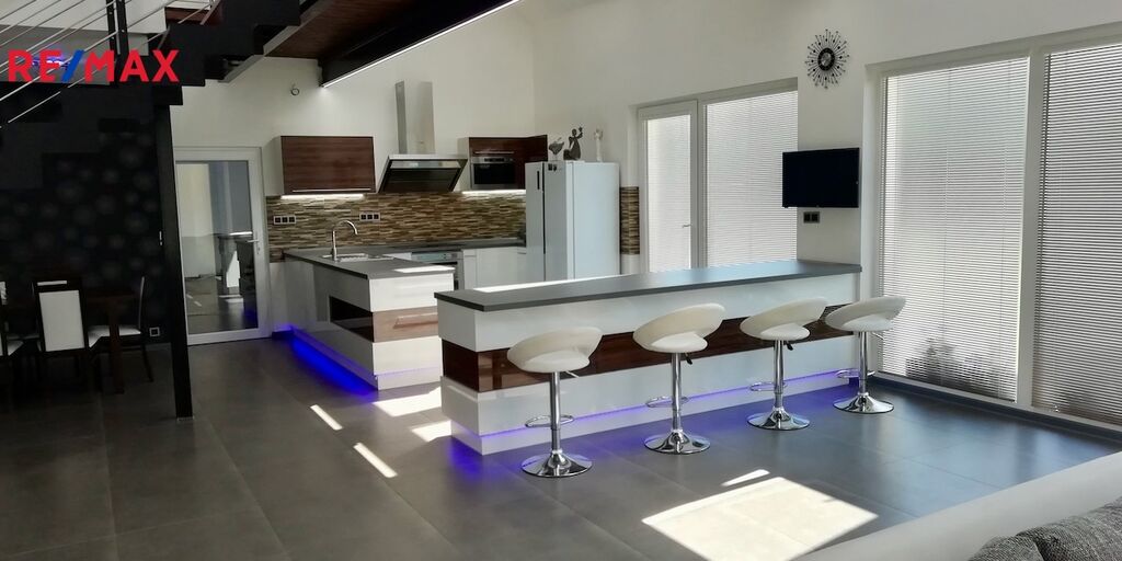 Jedinečně řešený nový dům ideálně propojený s okolní přírodou. Exkluzivitu nabídky umocňuje architektonické řešení interiéru - dům o užitné ploše 200 m2 je vzdušný a krásně prosvětlený. Srdcem domu je velký obývací pokoj s kuchyní a jídelnou o velikosti 92 m2, nad kterým je ochoz, který lze užívat např. jako pracovnu.