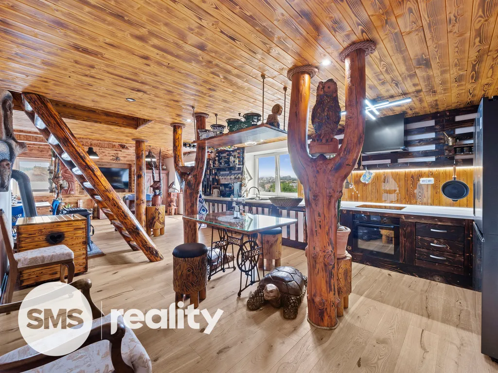 Byt je kompletně obložen kvalitním dřevem opáleným ohněm, které mu dodává atmosféru stylového horského srubu. Dominantou obytného prostoru jsou krbová kamna, která nejen efektivně vytápí celý byt, ale vytváří i jedinečnou atmosféru domova.