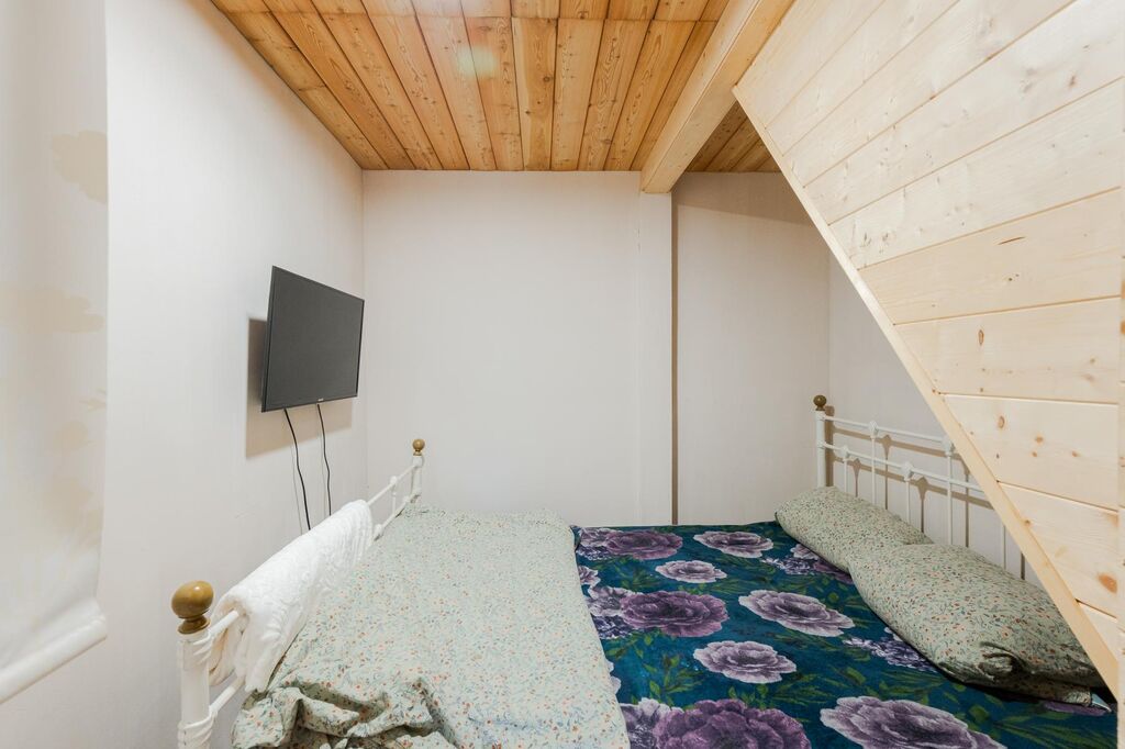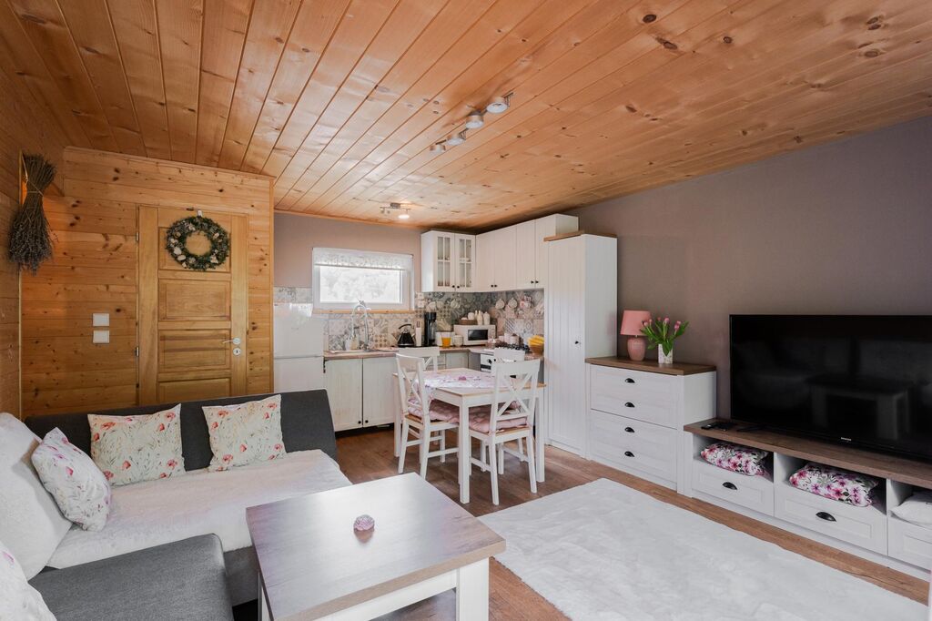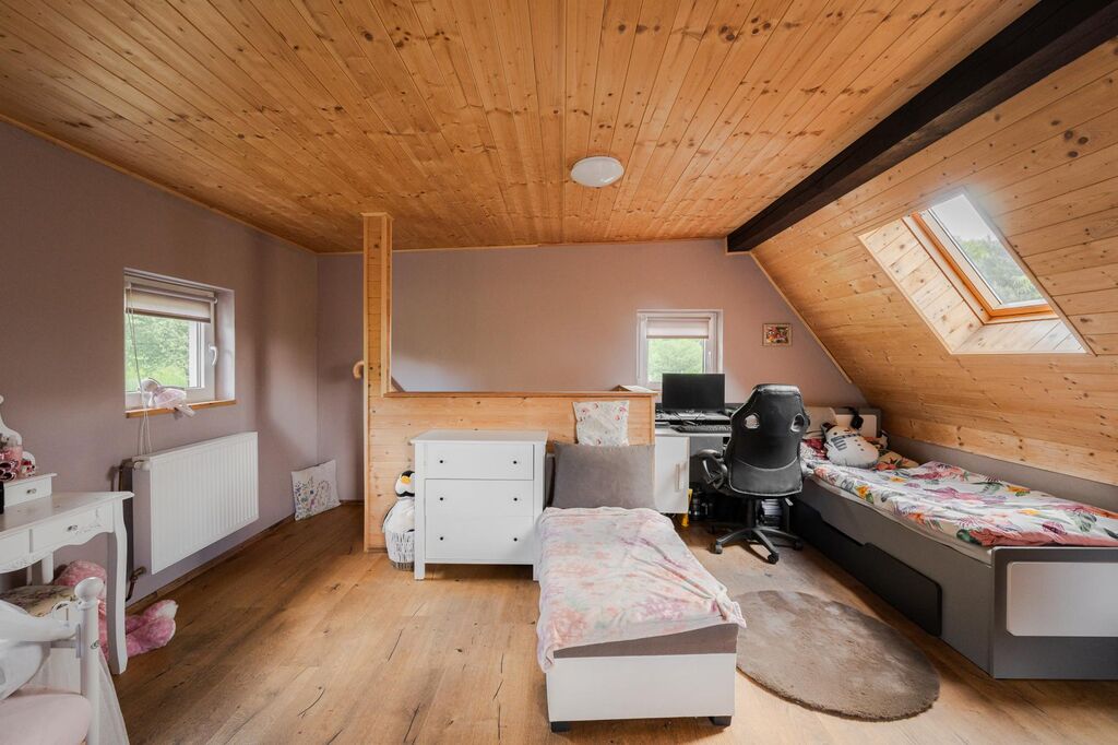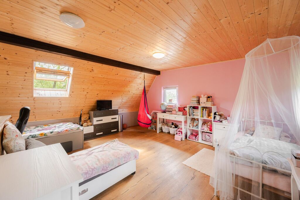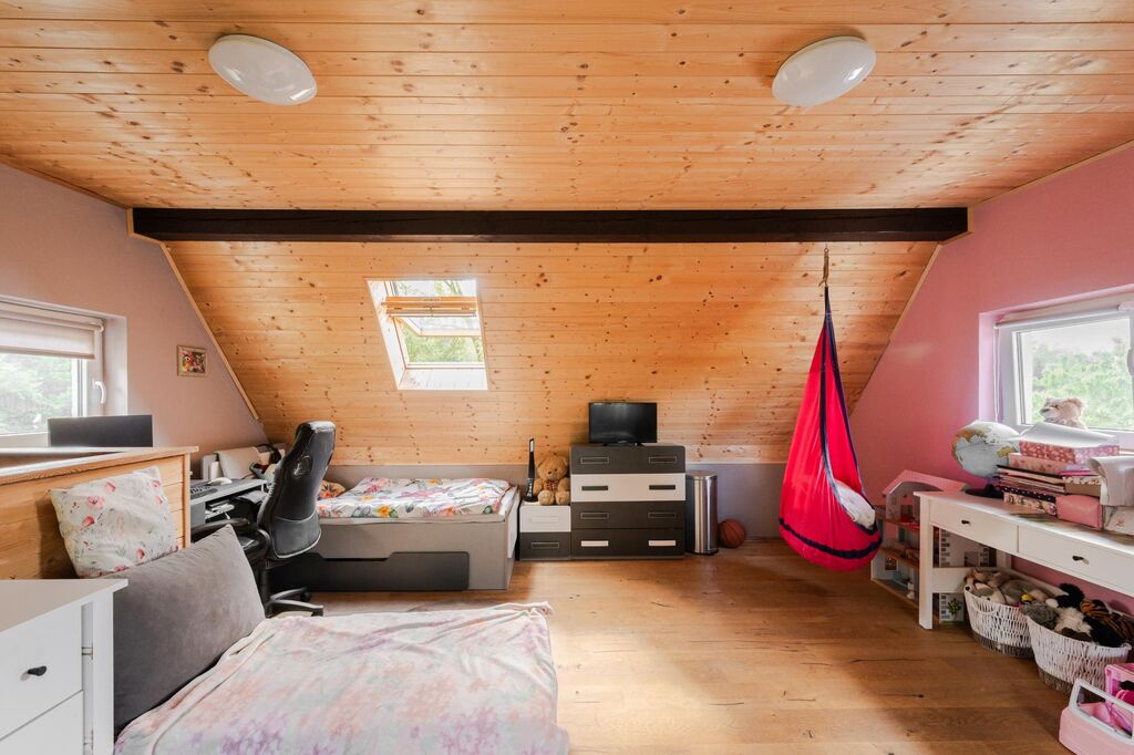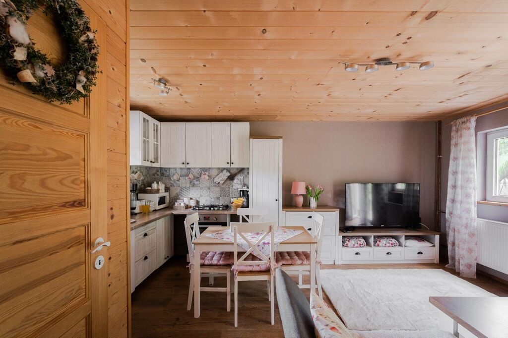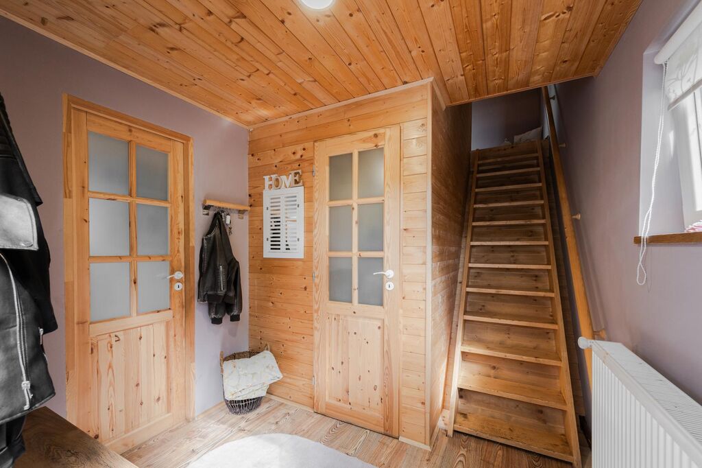 V chatě se pak nachází vstupní předsíň a menší ložnice. V úrovni přízemí je obývací pokoj s plně vybavenou kuchyňskou linkou a koupelnou se sprchovým koutem a WC. Z obývacího pokoje je vstup francouzským oknem na terasu (13,75m) spojenou se zahradou. V podkroví je vytvořen prostorný dětský pokoj, který lze ponechat otevřený nebo rozdělit na 2 ložnice. Schody dřevěné. Prostorná technická místnost/garáž se nachází v suterénu, kde je umístěn kotel na pevná paliva a vodárna. Na zahradě se nachází skleník a příjemné posezení na terase.