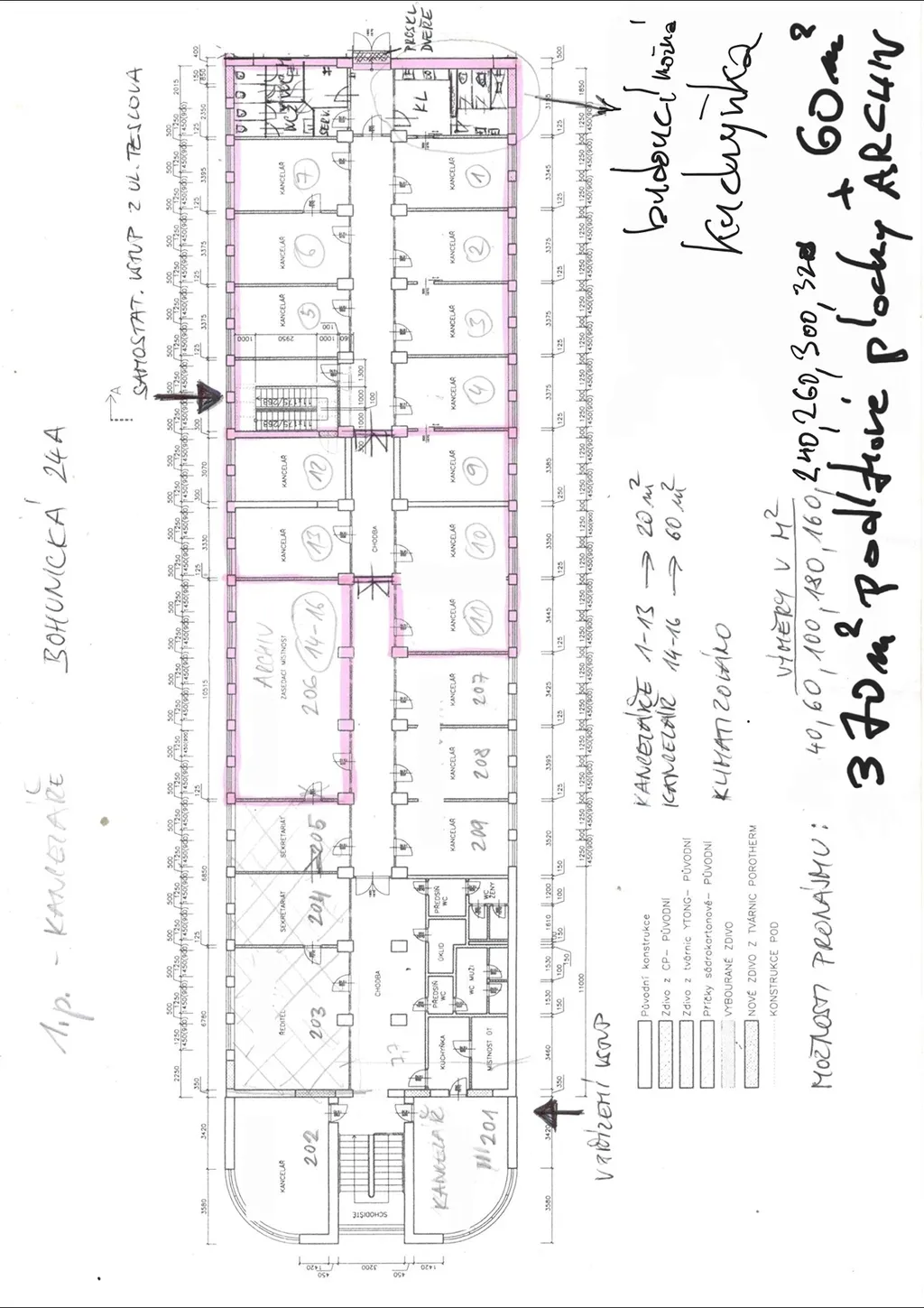 Výhodou je velká variabilita prostoru, možnost pronájmu částí celku od 40m2 užitné plochy (dvou kanceláří) viz foto plánku. Je tedy možné pronajmout 40m2,60m2,80m2,100m2,atd. - až 370m2 užitné plochy kanceláří. Plus ještě archiv což je dalších 60m2. Sádrokartonové příčky mezi kancelářemi lze upravit (upraví nájemce na vlastní náklady po souhlasu pronajímatele). Pro aktuální obsazenost více info po telefonu.