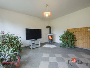 V přízemí najdeme prostorný obývací pokoj s krbovými kamny napojený na jídelnu s kuchyňským koutem, která přímo navazuje na venkovní terasu. Dále je zde umístěna velká dílna či prostor pro tělocvičnu s francouzskými okny a východem do zahrady. Zároveň je zde připravena místnost pro samostatnou toaletu.