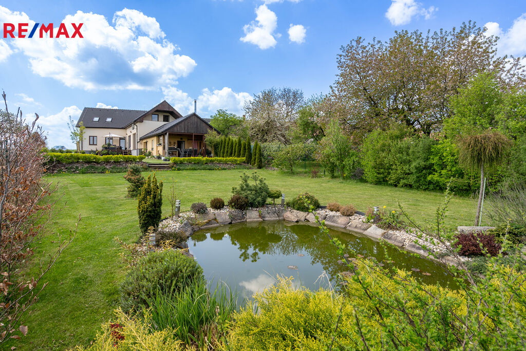 - Zahrada 1 239 m² s jezírkem, solitérními stromy a květinovými záhony
