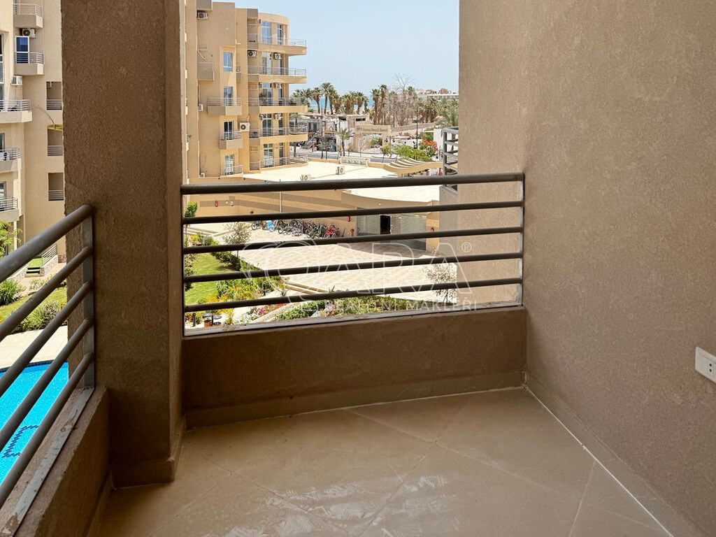 Nabízený byt je umístěn na 2. patře rezortu (4. podlaží) – pod tímto bytem je ještě 1. patro, přízemí a bazénové podlaží. Byt má balkon, ze kterého je výhled na hlavní bazén a moře.