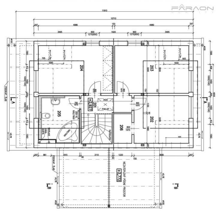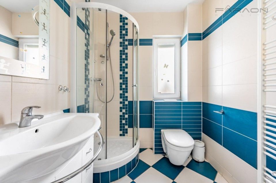 V patře najdete dva dětské pokoje, ložnici, praktickou šatnu a další koupelnu. Dům disponuje dvěma půdami jedna je chytře zrekonstruovaná na podkrovní hernu pro děti, druhá nad garáží slouží jako praktický úložný prostor pro sezónní věci.