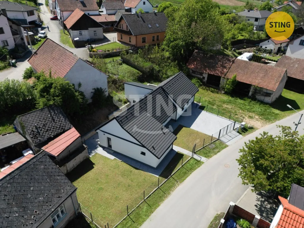 V přízemí najdete světlý obývací prostor propojený s kuchyňským koutem ve zvýšené části. Z kuchyně vede přímý vstup na zahradu. Dále jsou zde tři ložnice – dvě z nich mají výstup na terasu. Nechybí koupelna, chodba s denním světlem a praktická předsíň. Parkovat lze pohodlně přímo na pozemku. Součástí pozemku je i sklepní prostor ve svahu.