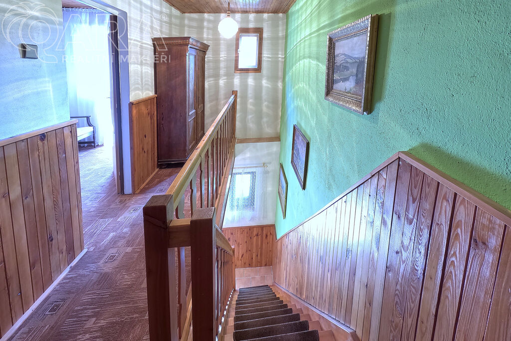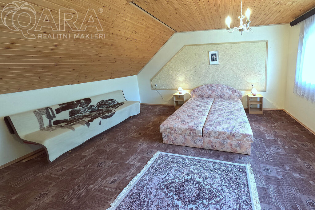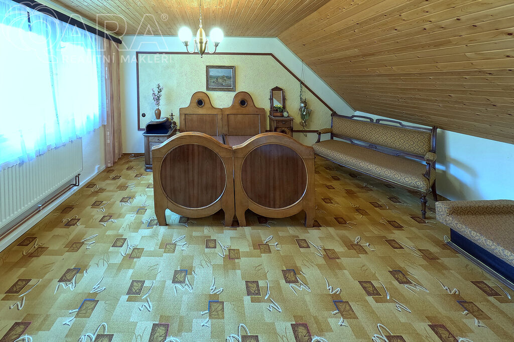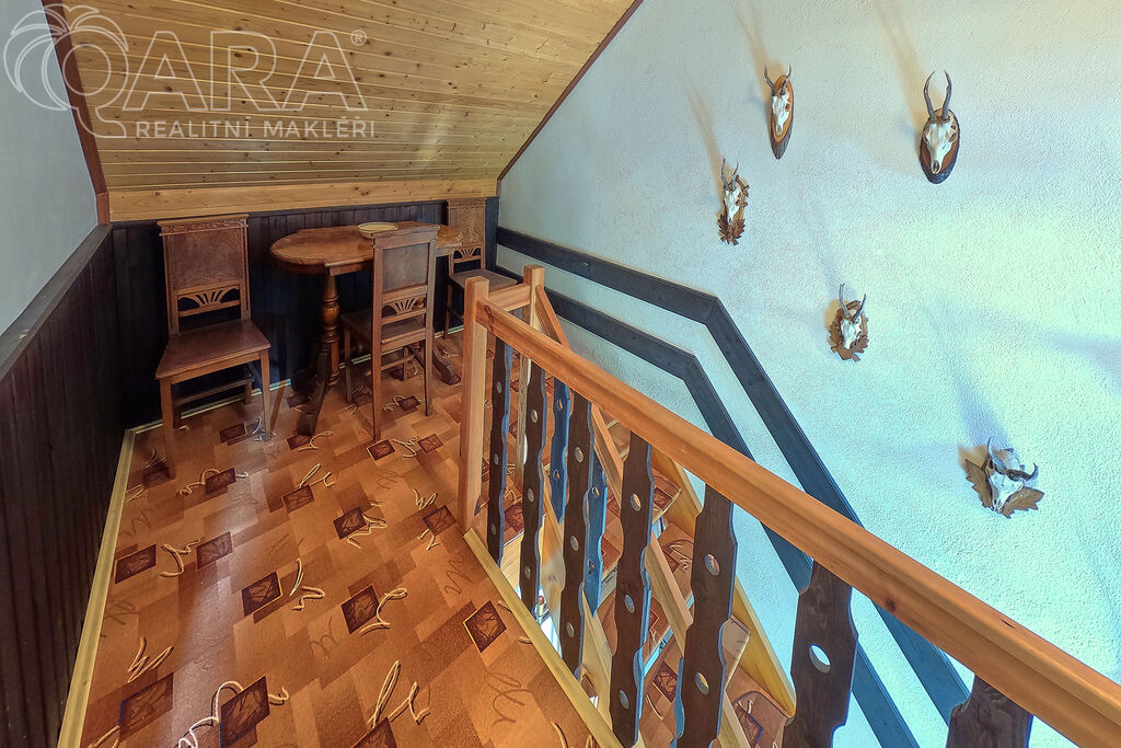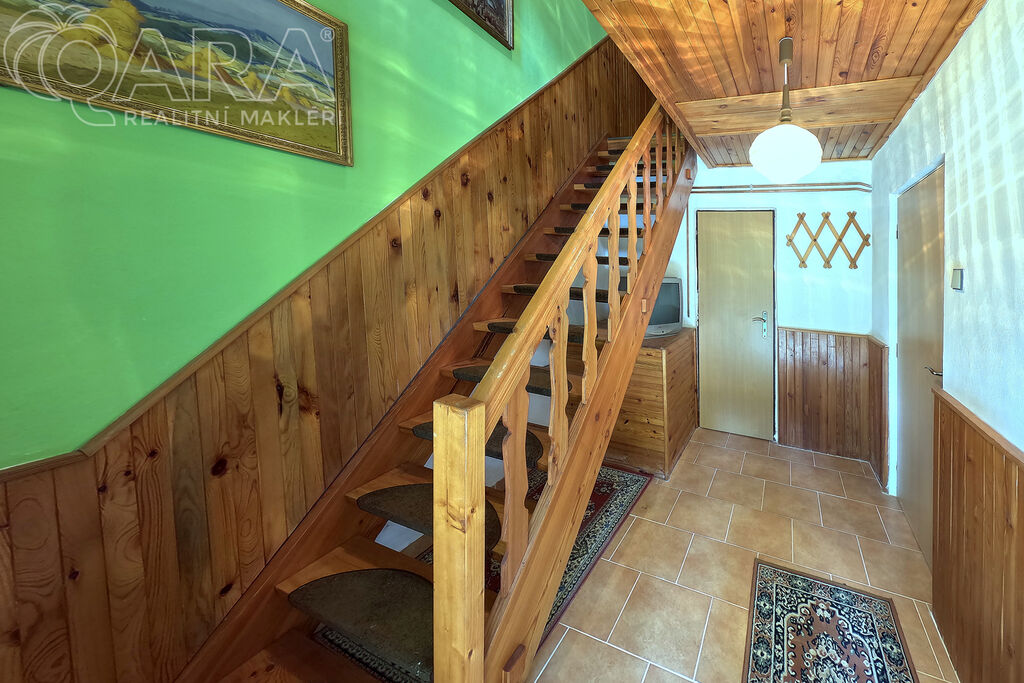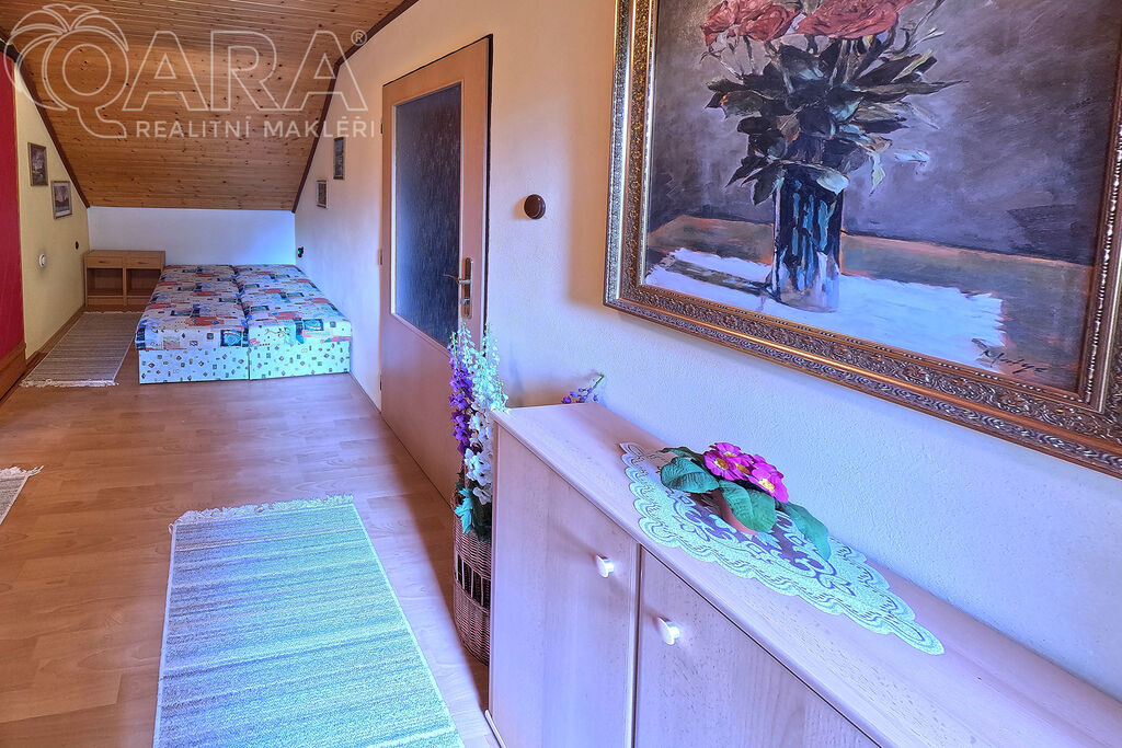 V patře jsou pak dvě průchozí ložnice a jako bonus velký balkón s výhledem na zalesněný protilehlý kopec.