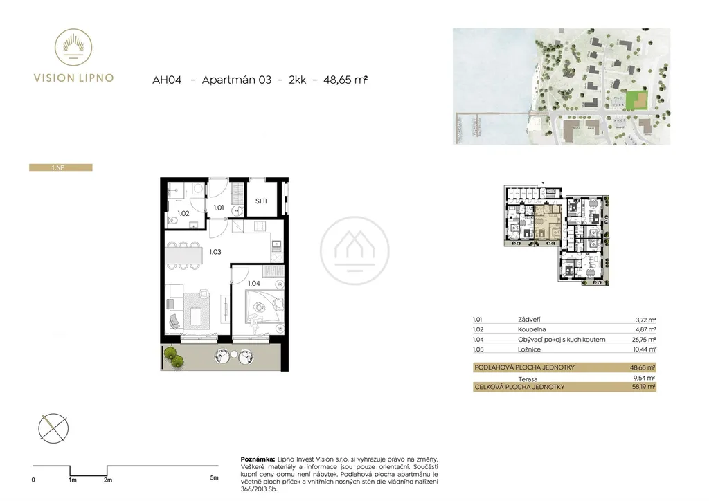 Apartmán 2+kk s podlahovou plochou 49m2 nabízí dostupné zázemí k rekreaci pro Vaši rodinu i budoucí hosty. Nachází se v přízemí apartmánového domu, který je navržen renomovaným ateliérem v souladu se šumavskou architekturou a důrazem na kvalitu stavebních materiálů. Jednotka disponuje zádveřím s vchodem do velkého obývacího pokoje s kuchyní, jídelnou a vstupem na krásnou terasu a zahradu s unikátním výhledem na vodní hladinu Lipna. Dále je součástí ložnice a koupelna. Cena apartmánu je včetně 21% DPH a zahrnuje také parkovací stání. Za příplatek je možné dokoupit sklepní jednotku a kotviště.
